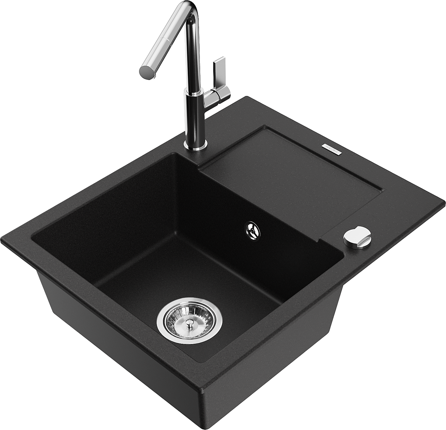 Mexen Enzo 1-medencés gránit mosogató csepegtetővel és Flora konyhai csapteleppel, fekete - 6506-77-670401-00