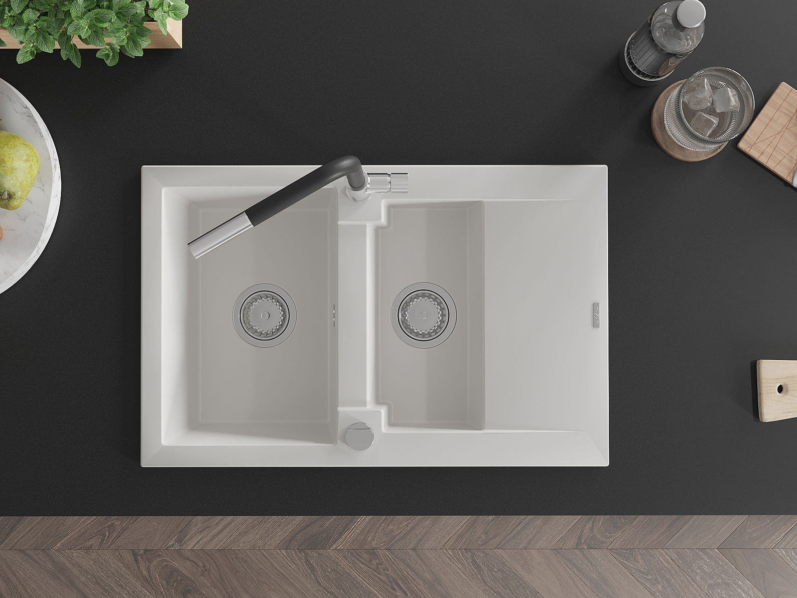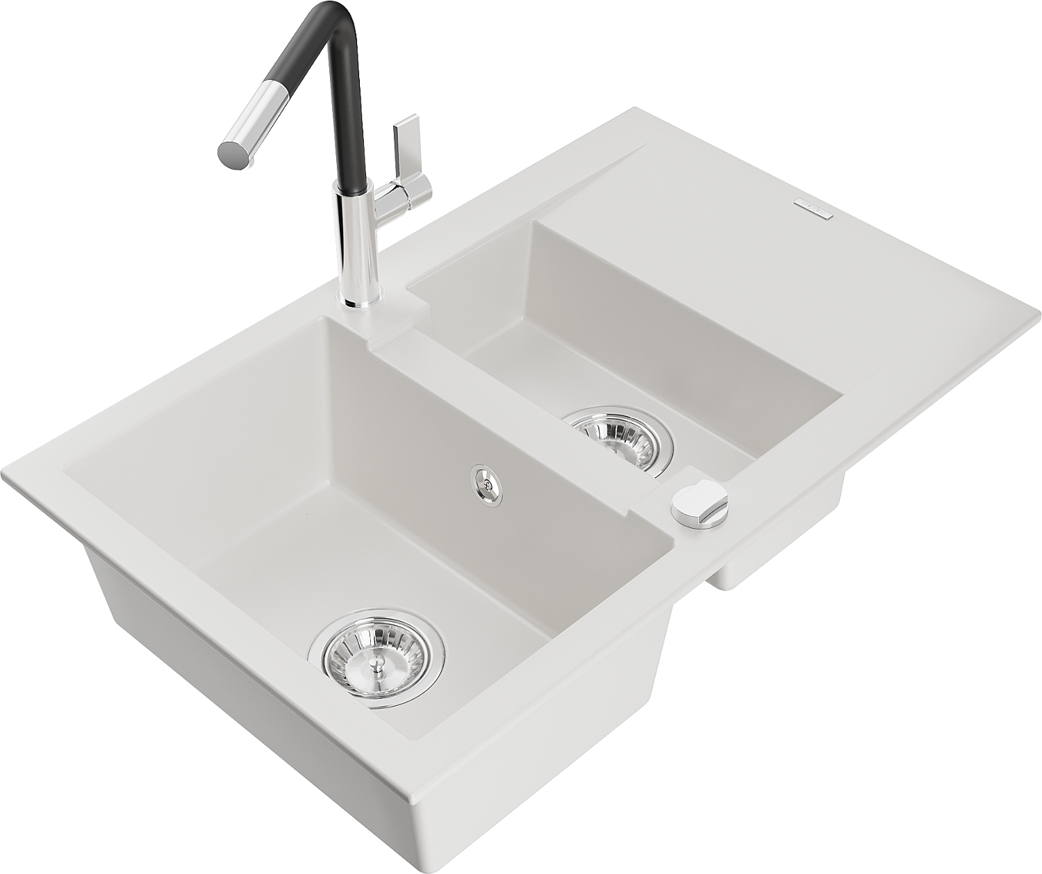 Mexen Gaspar gránit mosogató 1,5 medencével, csepegtetővel és Flora konyhai csapteleppel, fehér - 6507-20-670401-07