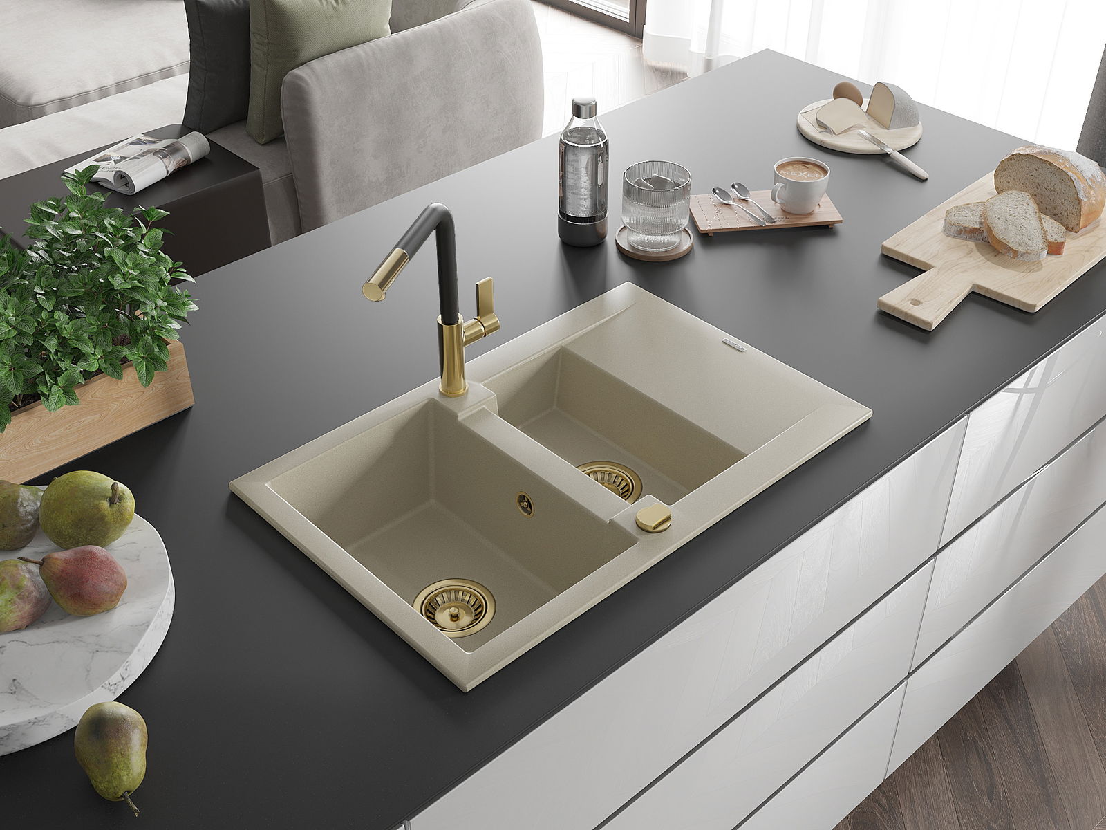 Mexen Gaspar 1,5-medencés gránitmosogató csepegtetővel és Flora konyhai csapteleppel, bézs - 6507-69-670401-57-G