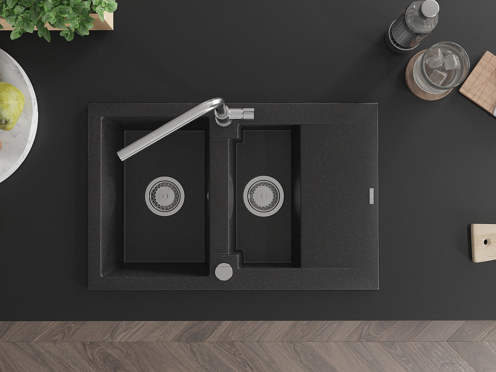Mexen Gaspar gránit mosogató 1,5 rekeszes csepegtetővel és Flora konyhai csapteleppel, fekete/ezüst - 6507-73-670401-00