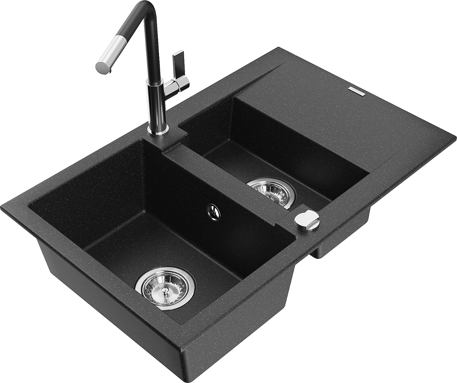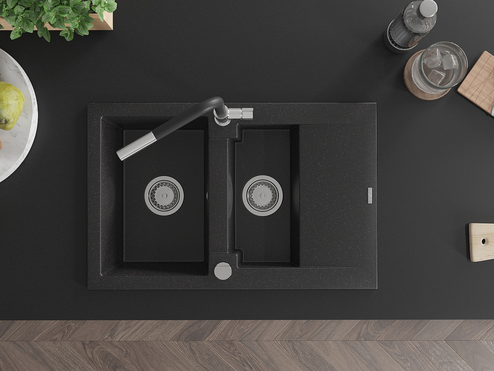 Mexen Gaspar gránit mosogató 1,5 rekeszes csepegtetővel és Flora konyhai csapteleppel, fekete/ezüst - 6507-73-670401-07