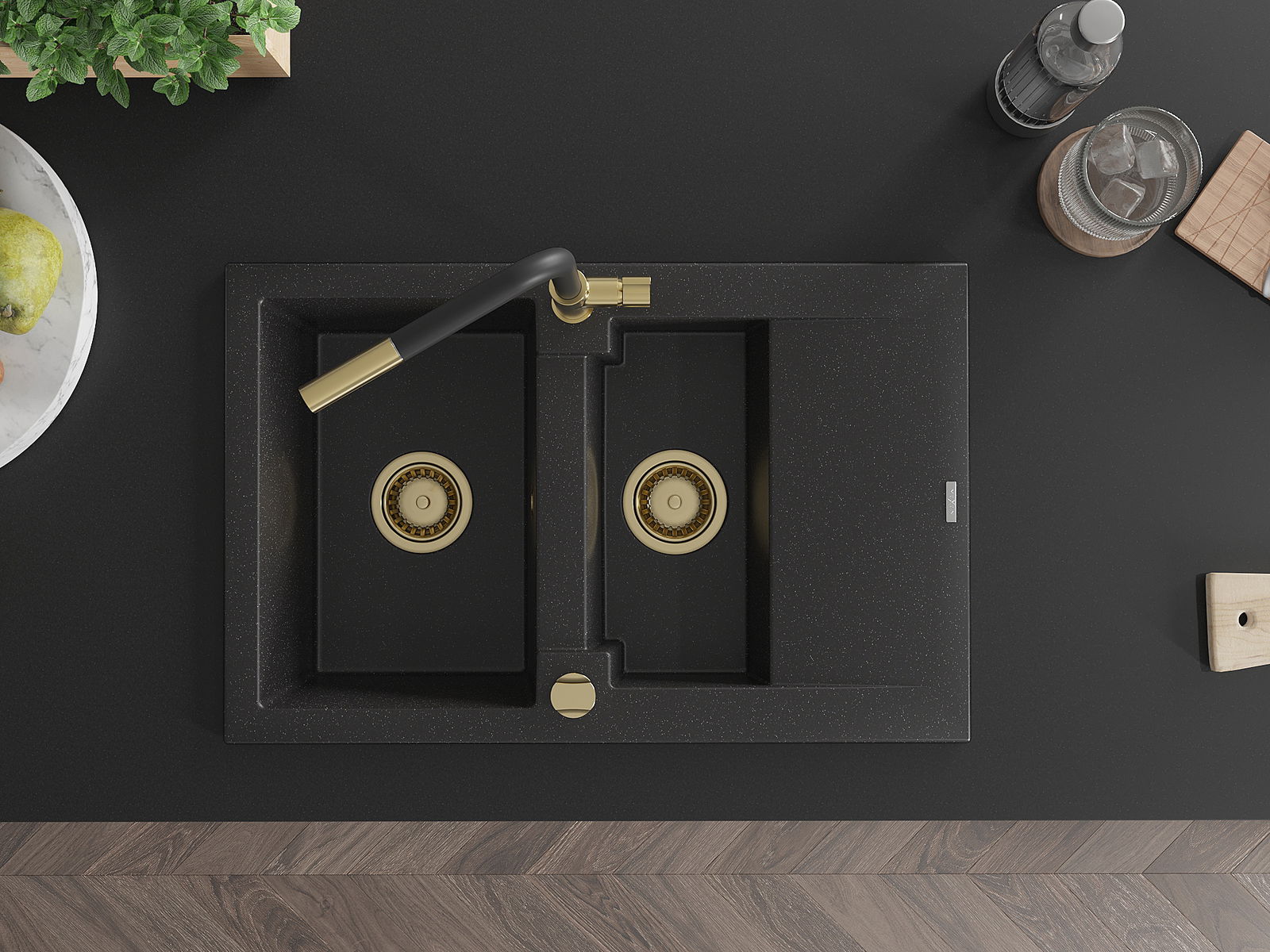 Mexen Gaspar gránit mosogató 1,5 medencés csepegtetővel és Flora konyhai csapteleppel, fekete/ezüst - 6507-73-670401-57-G