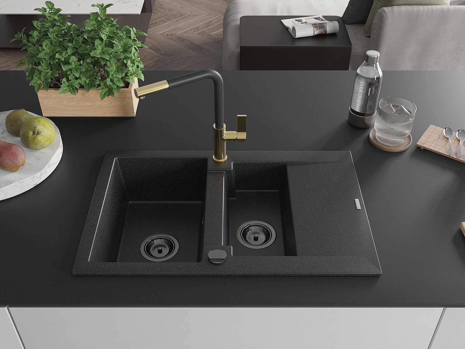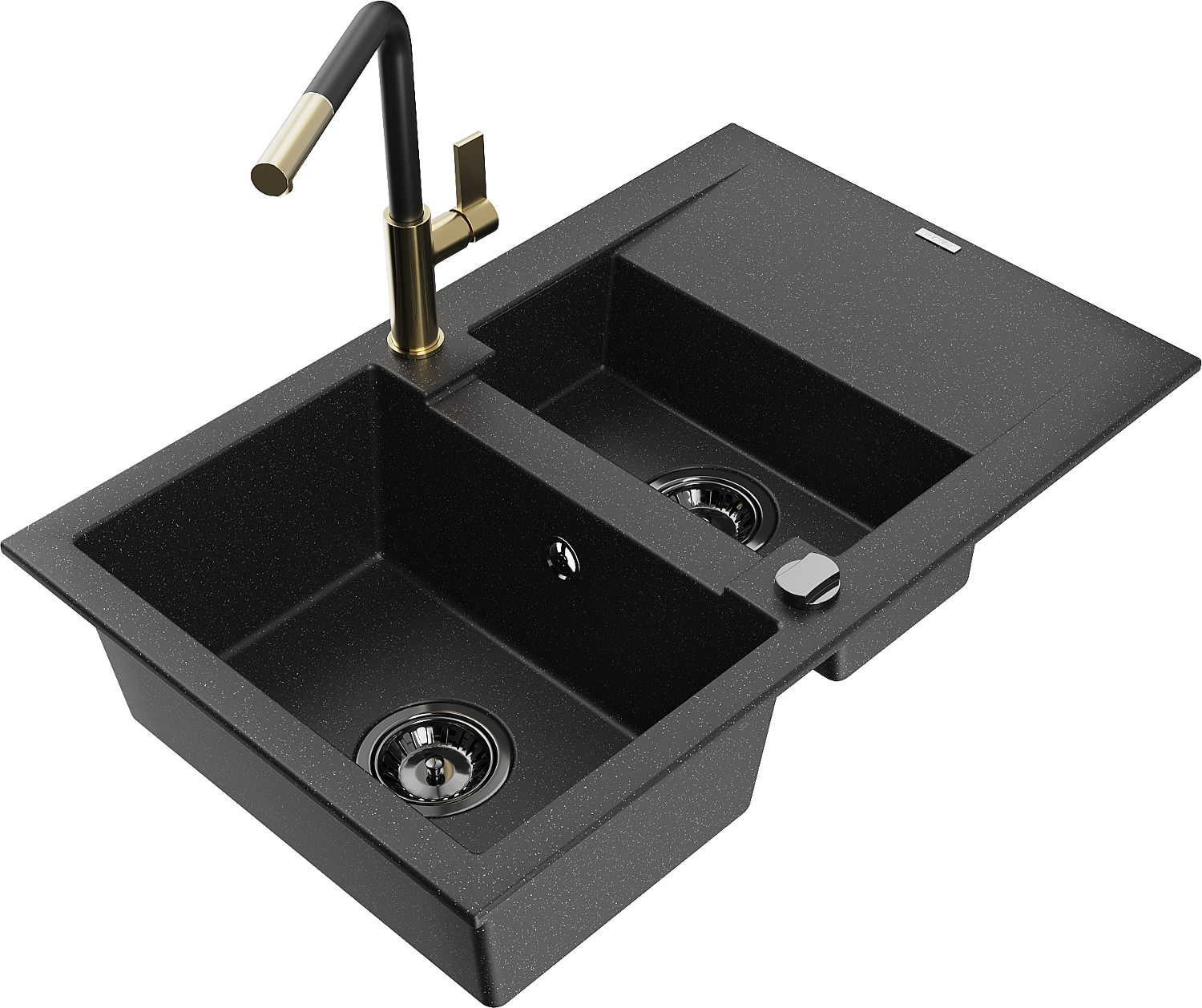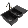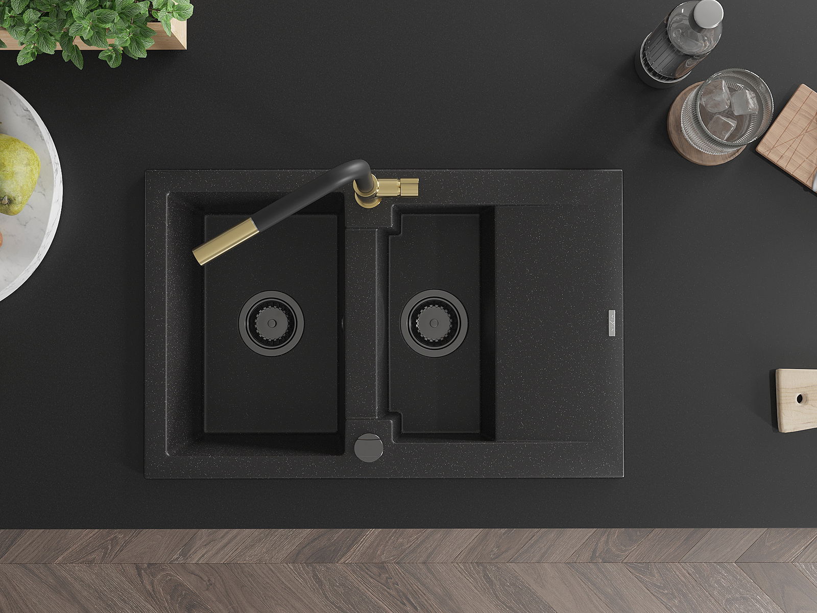 Mexen Gaspar gránit mosogató 1,5 rekeszes csepegtetővel és Flora konyhai csapteleppel, fekete/ezüst - 6507-73-670401-57-B