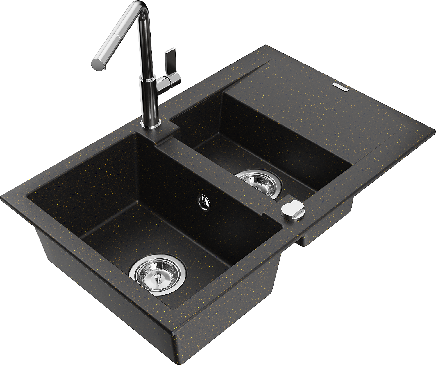 Mexen Gaspar gránit mosogató 1,5-medencés csepegtetővel és Flora konyhai csapteleppel, fekete/arany metál - 6507-75-670401-00