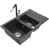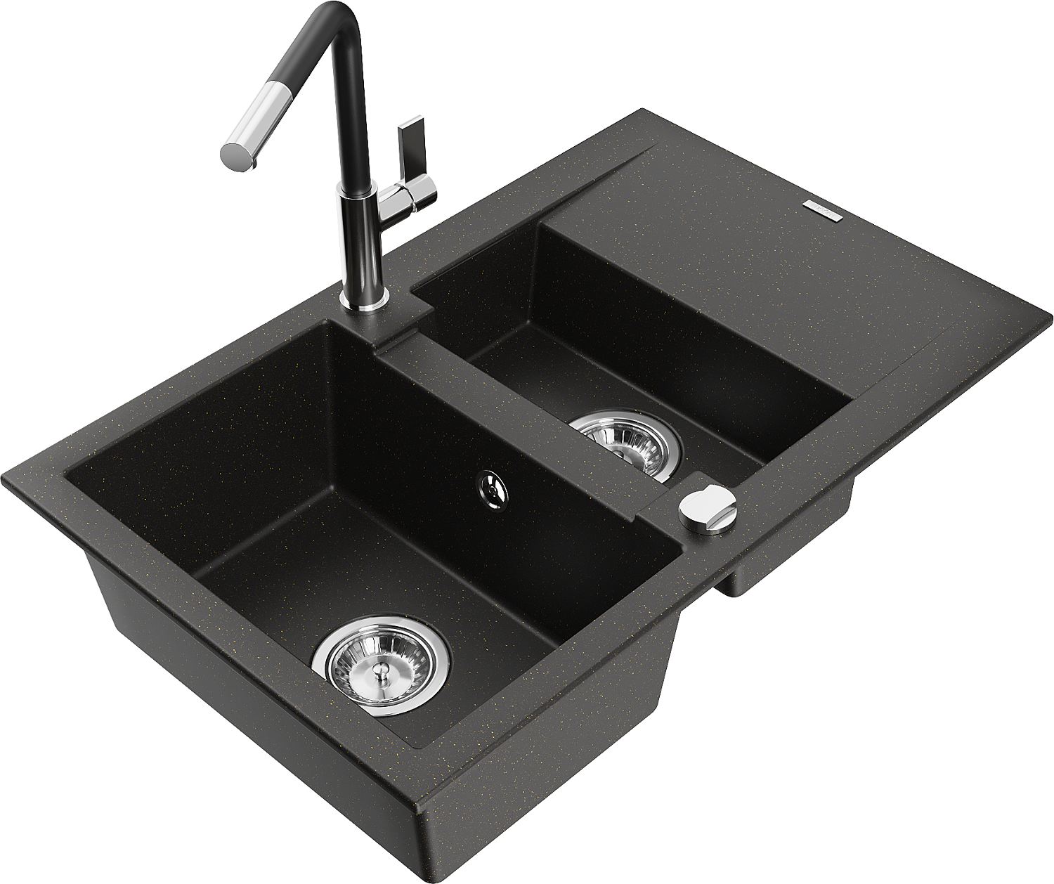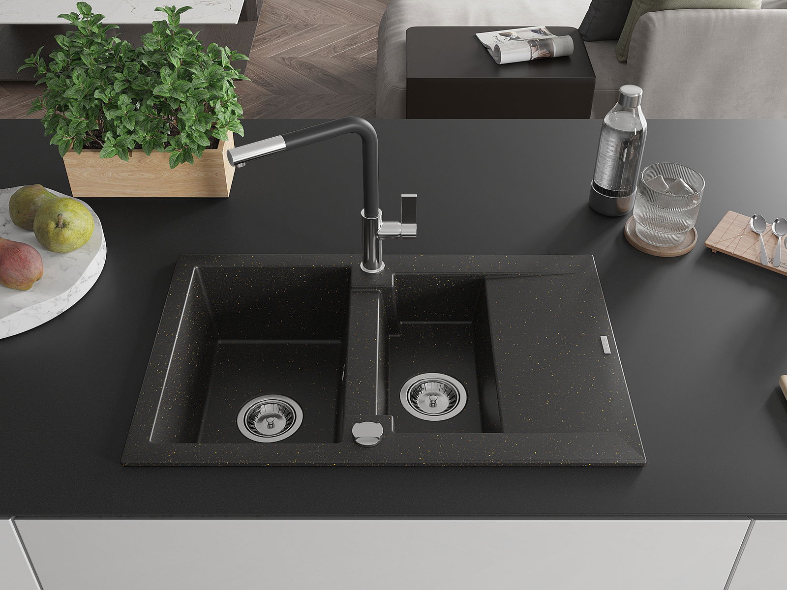 Mexen Gaspar 1,5-medencés gránit mosogató csepegtetővel és Flora konyhai csapteleppel, fekete/arany metál - 6507-75-670401-07