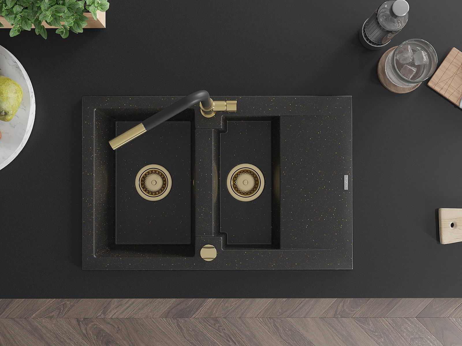 Mexen Gaspar gránit mosogató 1,5-medencés csepegtetővel és Flora konyhai csapteleppel, fekete/arany - 6507-75-670401-57-G
