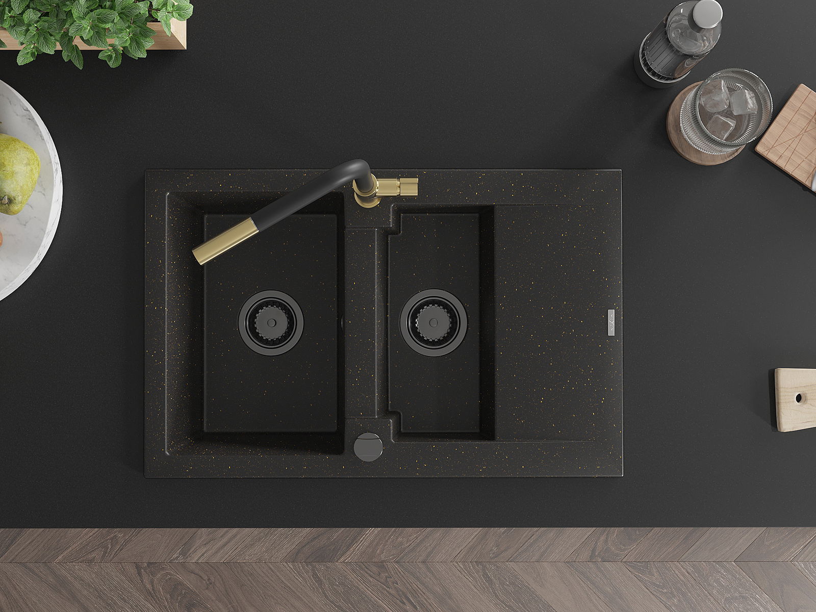 Mexen Gaspar gránit mosogatókagyló 1,5 tálcás csepegtetővel és Flora konyhai csapteleppel, fekete/arany - 6507-75-670401-57-B