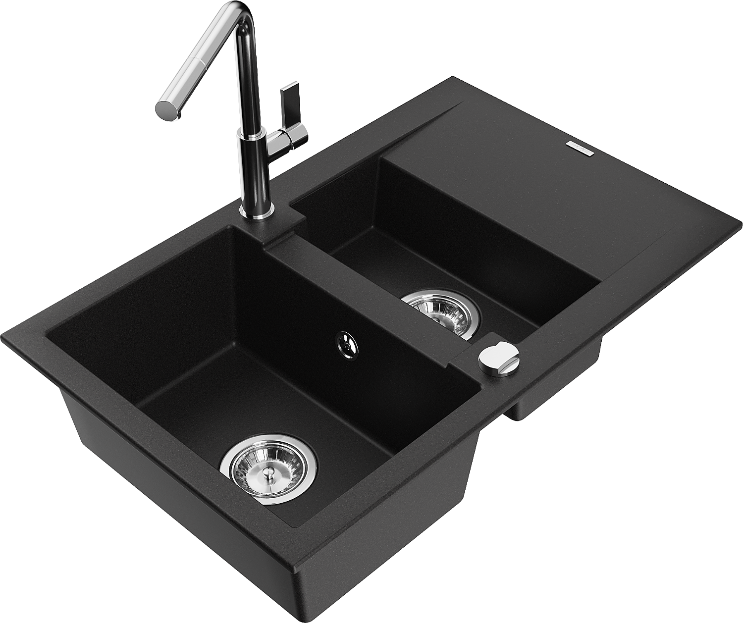 Mexen Gaspar gránit mosogató 1,5 rekeszes csepegtetővel és Flora konyhai csapteleppel, fekete - 6507-77-670401-00