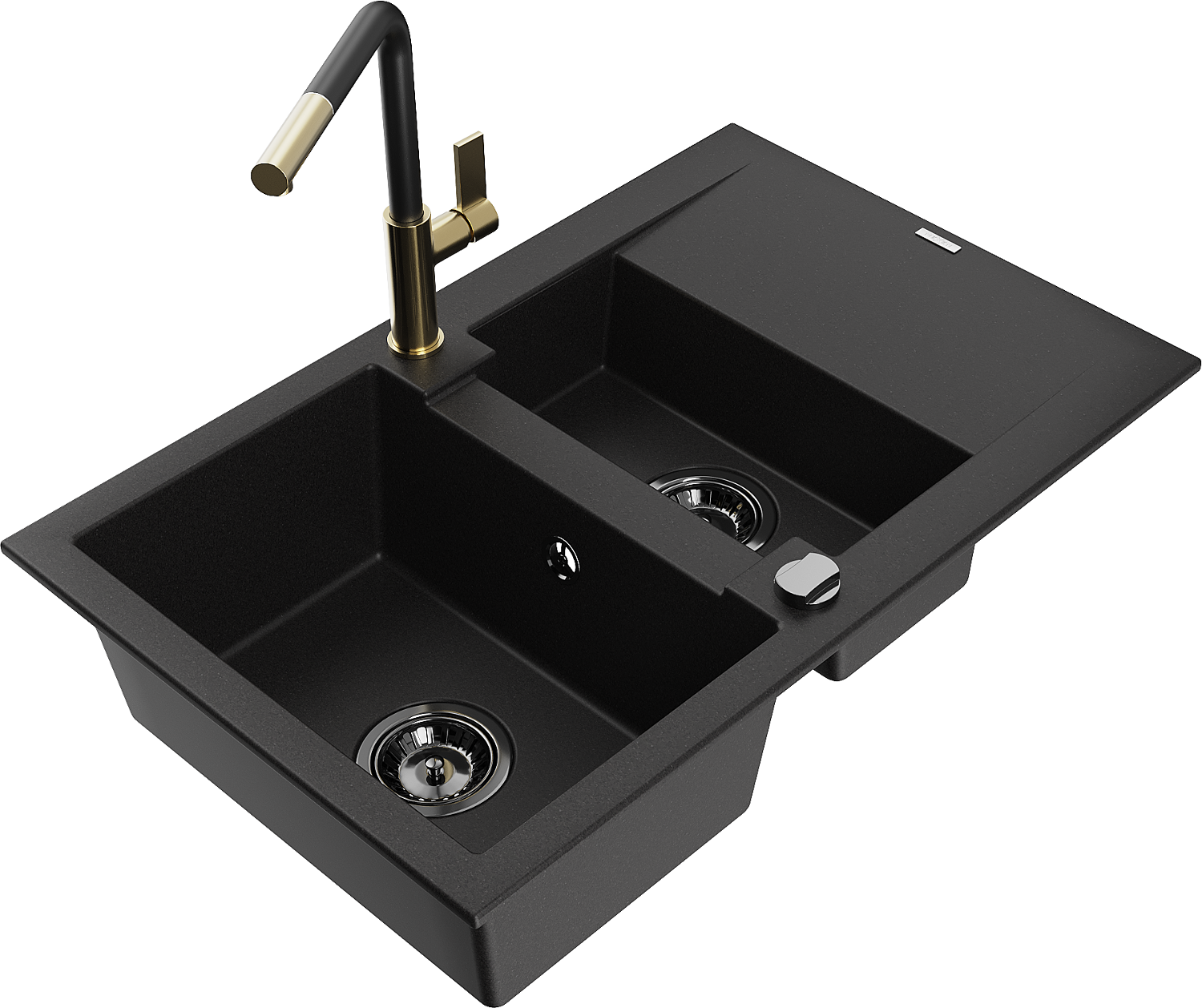 Mexen Gaspar gránit mosogató 1,5 rekeszes csepegtetővel és Flora konyhai csapteleppel, fekete - 6507-77-670401-57-B