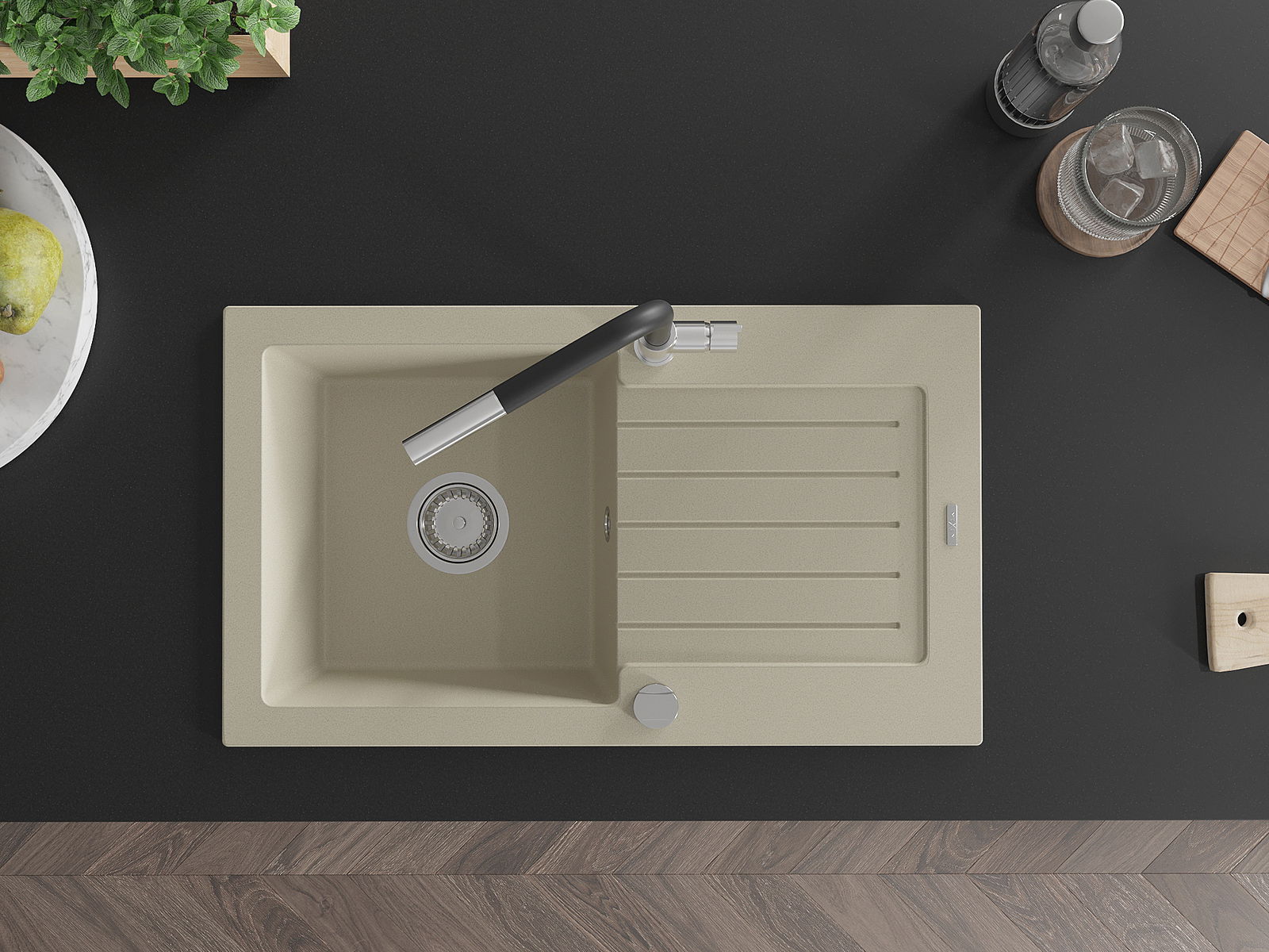 A mosogató kiváló minőségű gránitból készül. Ez egy elegáns és mindenekelőtt minden konyhához praktikus kiegészítés, stílusától függetlenül. A kiváló minőségű és a gránit tartósság biztosítja a sok éves használatát.