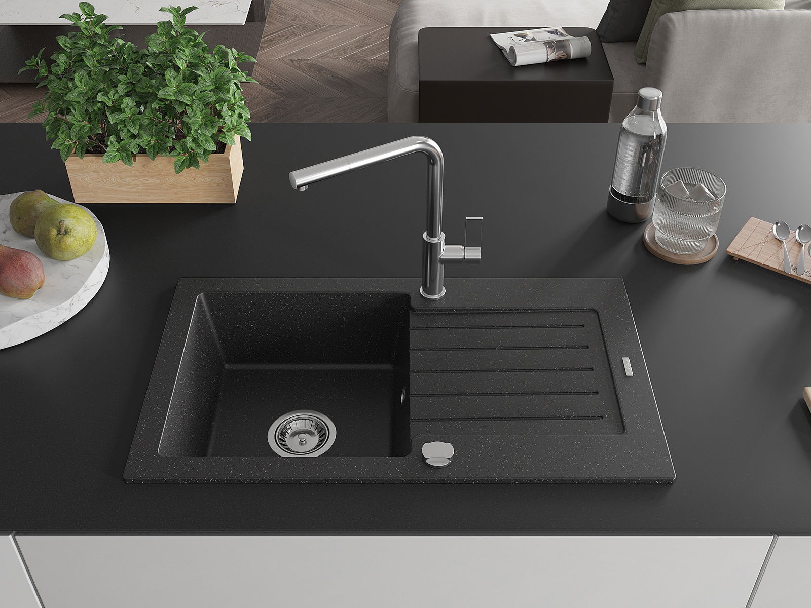 Mexen Pablo 1-kamrás gránit mosogató csepegtetővel és Flora konyhai csapteleppel, fekete/ezüst metál - 6510-73-670401-00