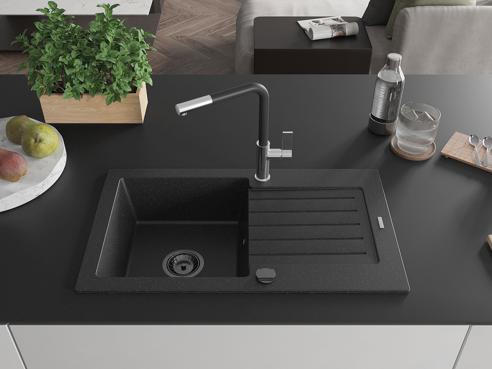 Mexen Pablo egymedencés gránit mosogató lefolyóval és Flora konyhai csappal, fekete/ezüst metál - 6510-73-670401-07-B