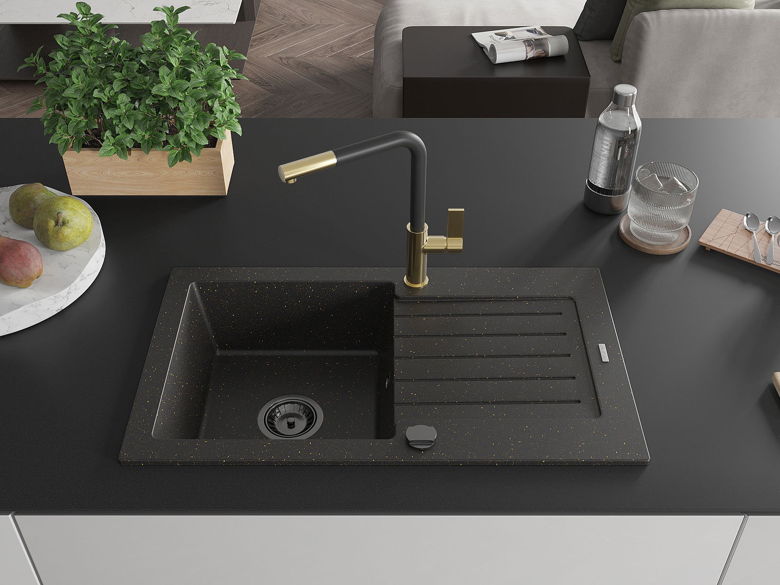 Mexen Pablo gránit mosogató 1-medencés csepegtetővel és Flora konyhai csappal, fekete/arany metál - 6510-75-670401-57-B