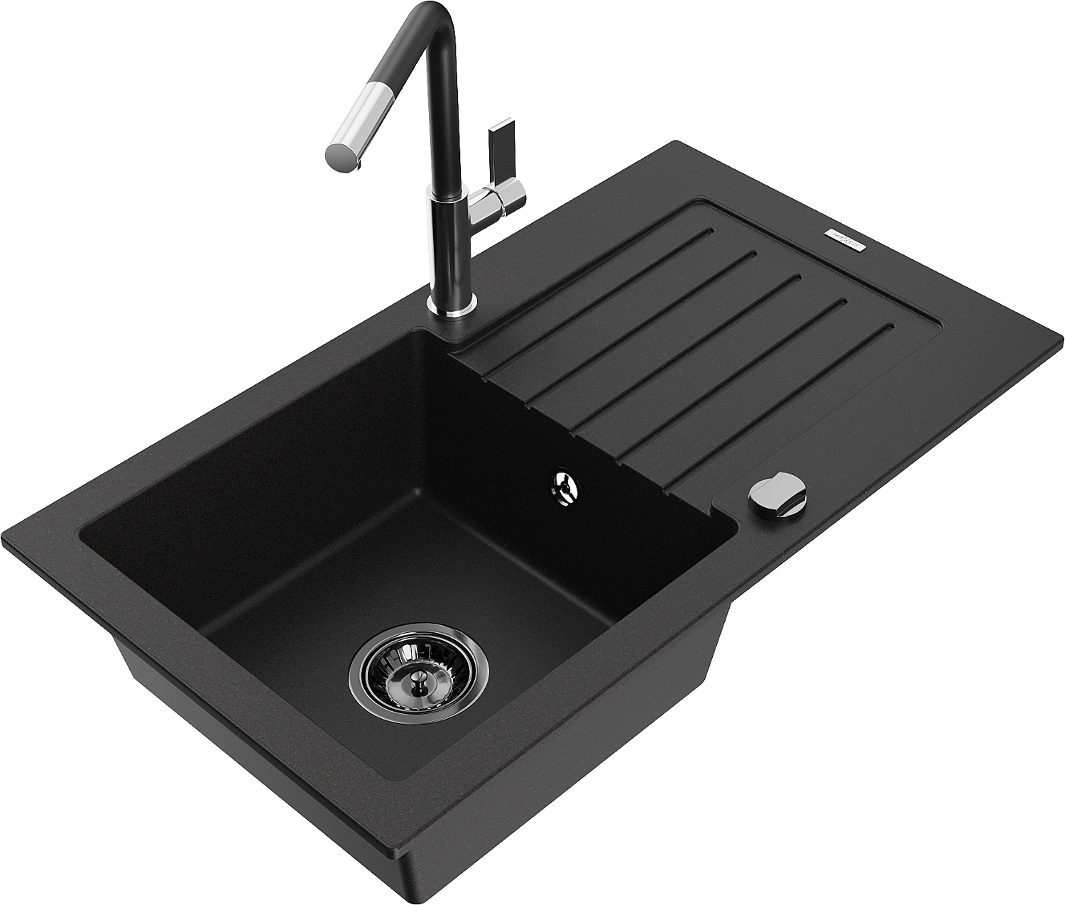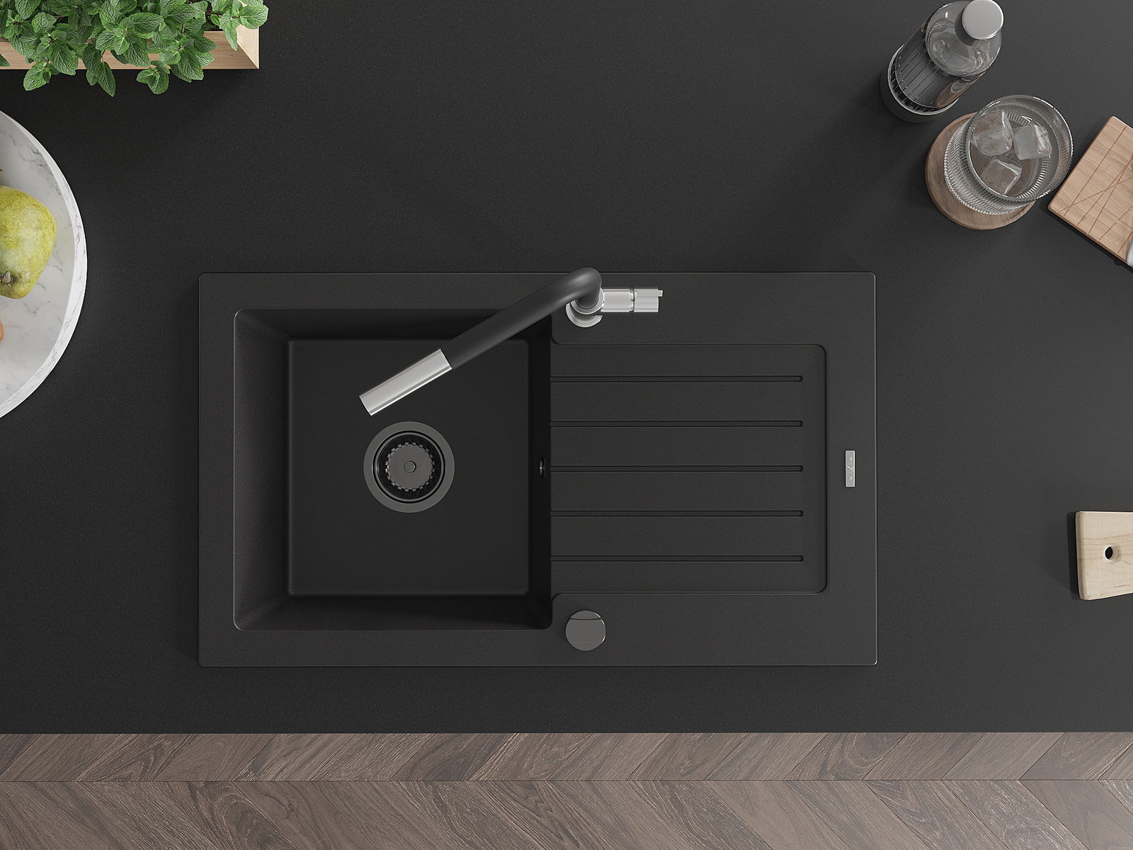 Mexen Pablo egymedencés gránit mosogatótálca csepegtetővel és Flora konyhai csappal, fekete - 6510-77-670401-07-B