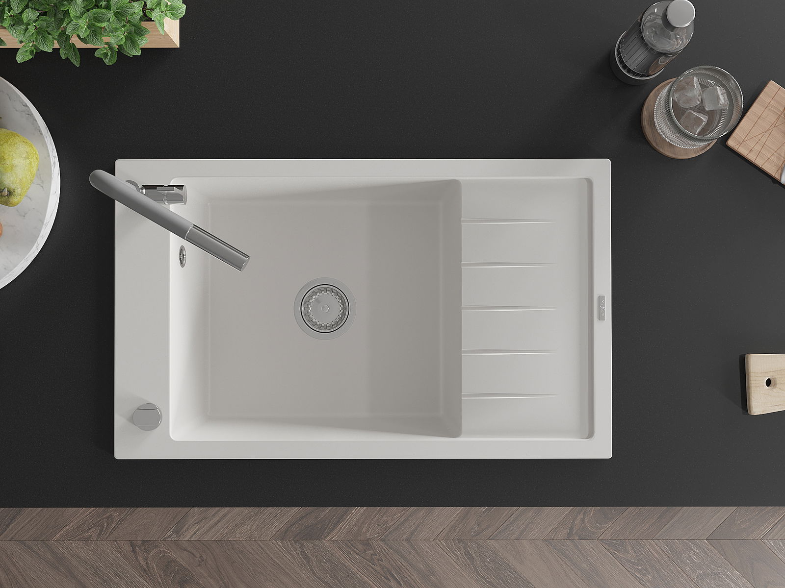 A mosogató felülete ellenáll a foltoknak és a elszíneződésnek, amelynek köszönhetően könnyű megtisztítani és hosszú ideig megtartja színét. Esztétikai és gyakorlatilag kiegészítve minden konyhát.