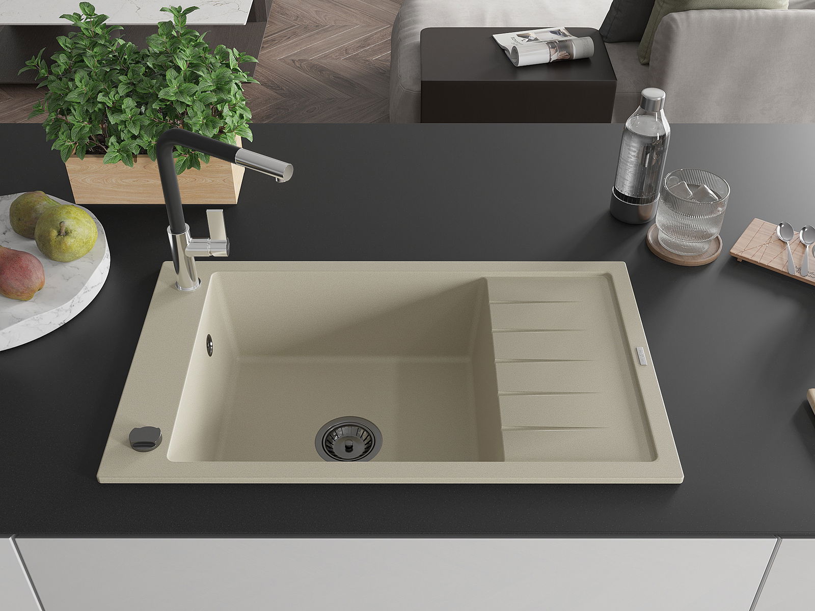 A mosogató kiváló minőségű gránitból készül. Ez egy elegáns és mindenekelőtt minden konyhához praktikus kiegészítés, stílusától függetlenül. A kiváló minőségű és a gránit tartósság biztosítja a sok éves használatát.