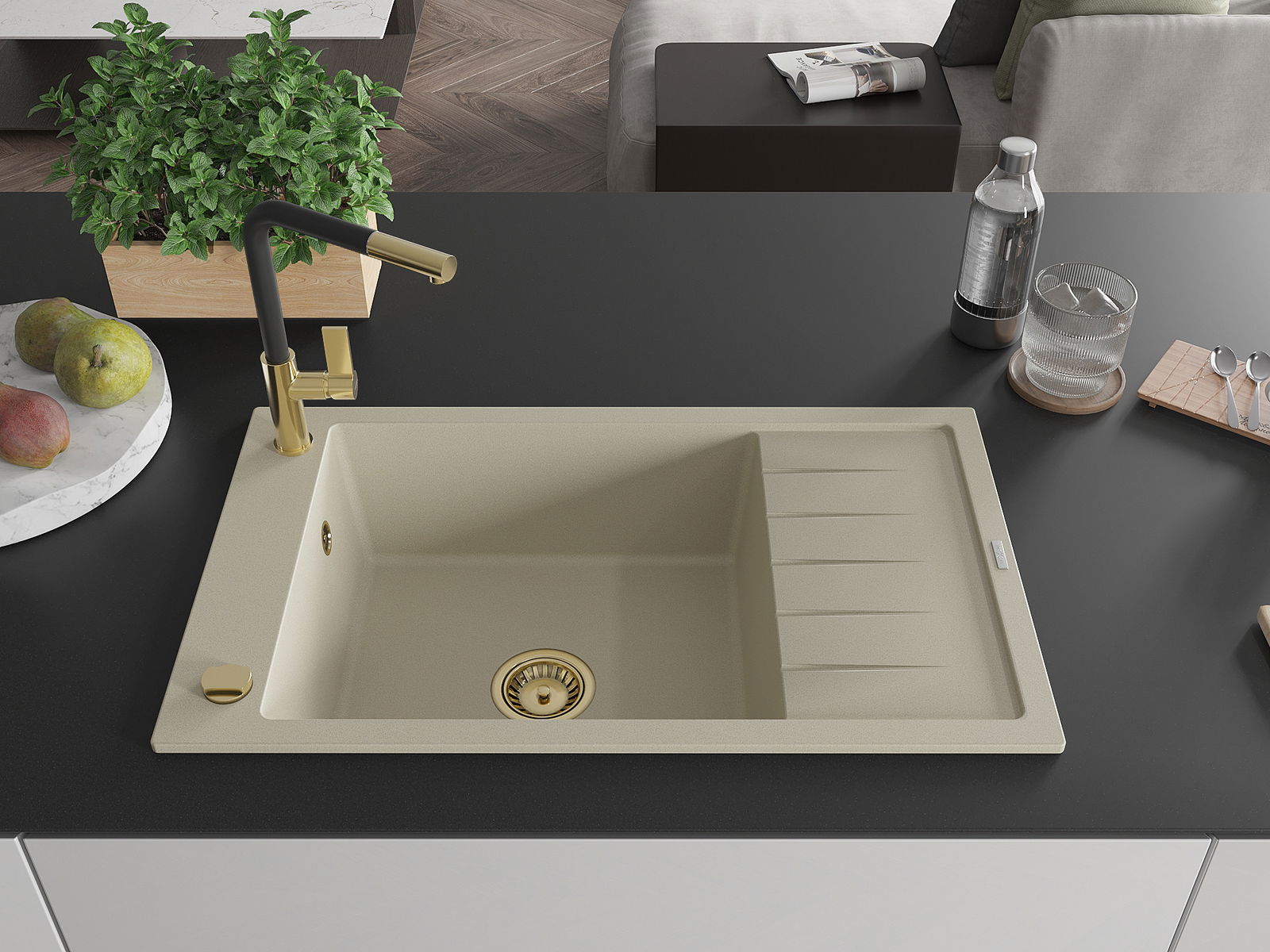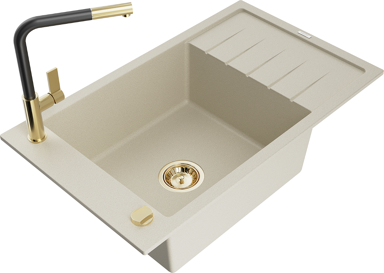 Mexen Elias gránit mosogató 1 medencés csepegtetővel és Flora konyhai csapteleppel, bézs - 6511-69-670401-57-G