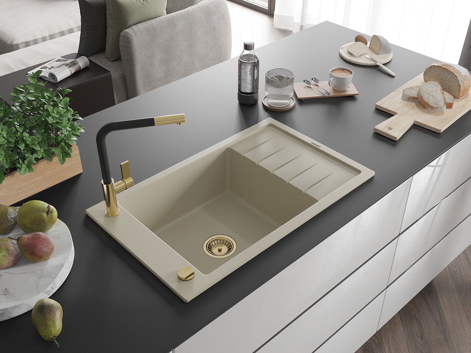 A mosogató kiváló minőségű gránitból készül. Ez egy elegáns és mindenekelőtt minden konyhához praktikus kiegészítés, stílusától függetlenül. A kiváló minőségű és a gránit tartósság biztosítja a sok éves használatát.