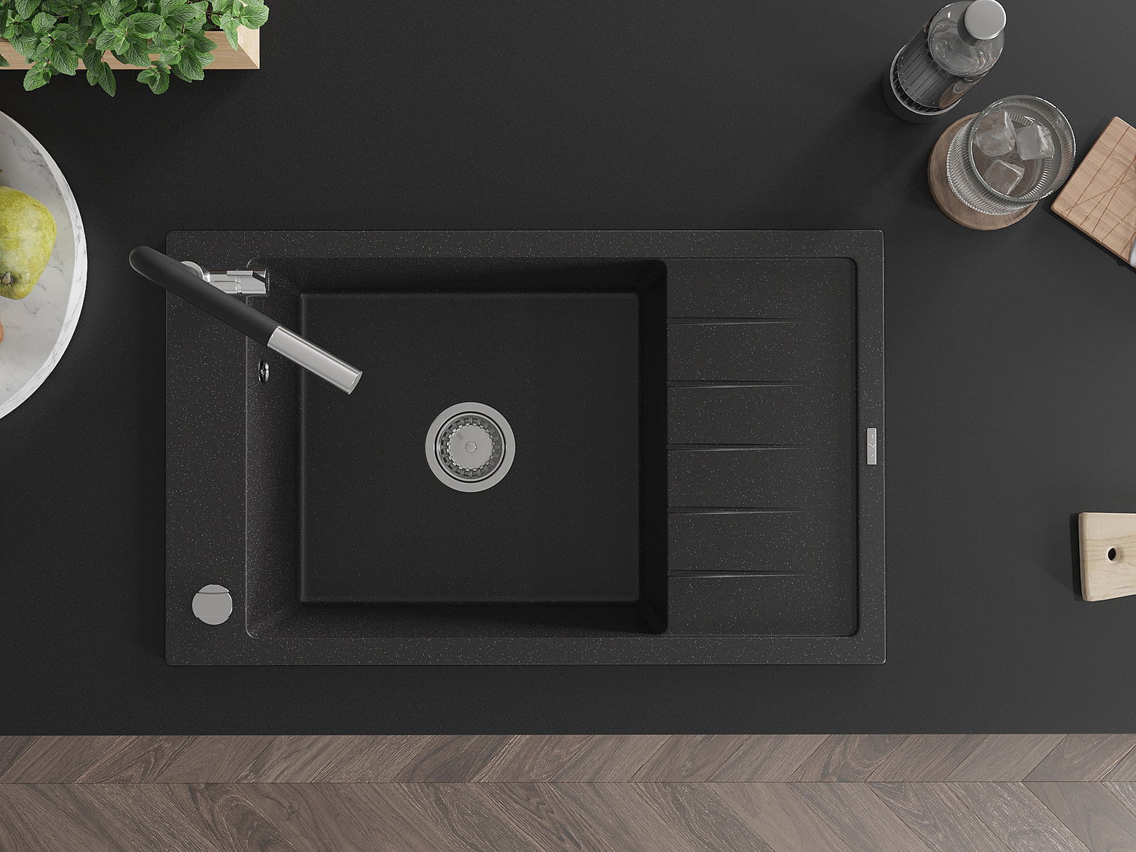Mexen Elias egymedencés gránit mosogató csepegtetővel és Flora konyhai csapteleppel, fekete/ezüst metál - 6511-73-670401-07