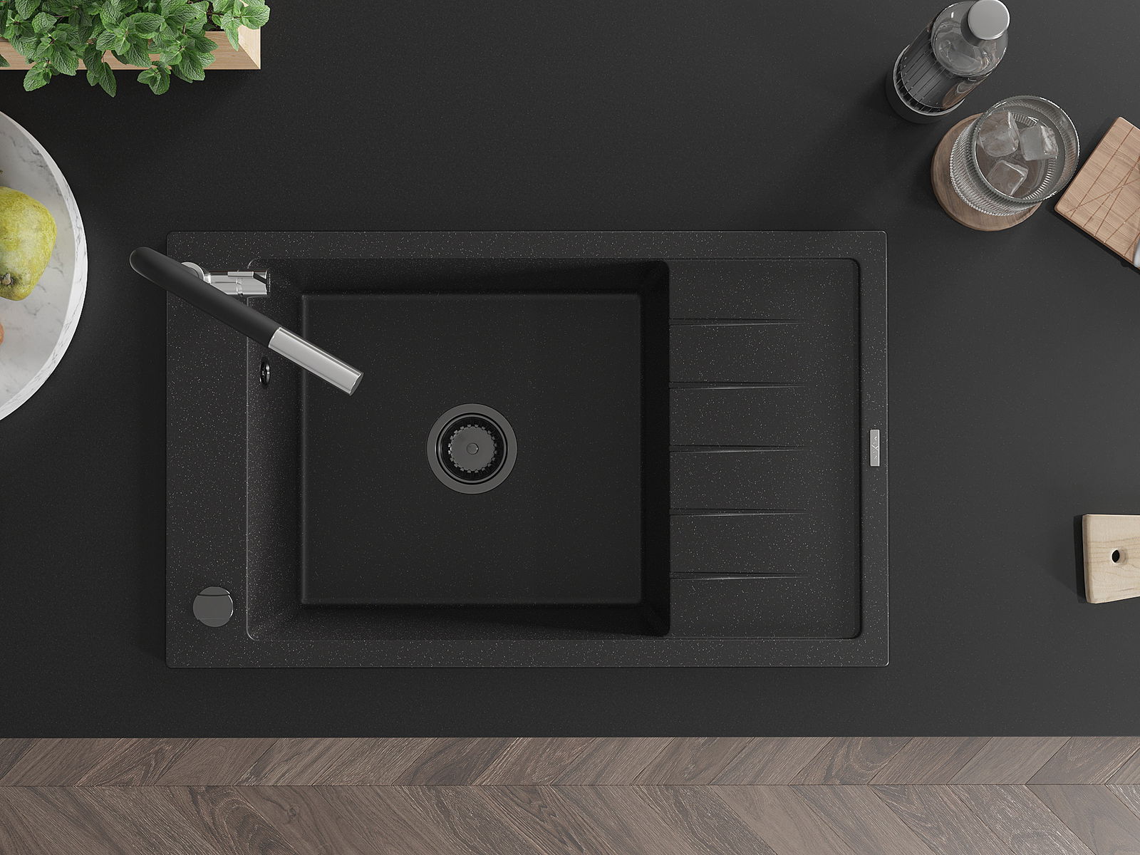 Mexen Elias egymedencés gránit mosogató csepegtetővel és Flora konyhai csapteleppel, fekete/ezüst metál - 6511-73-670401-07-B
