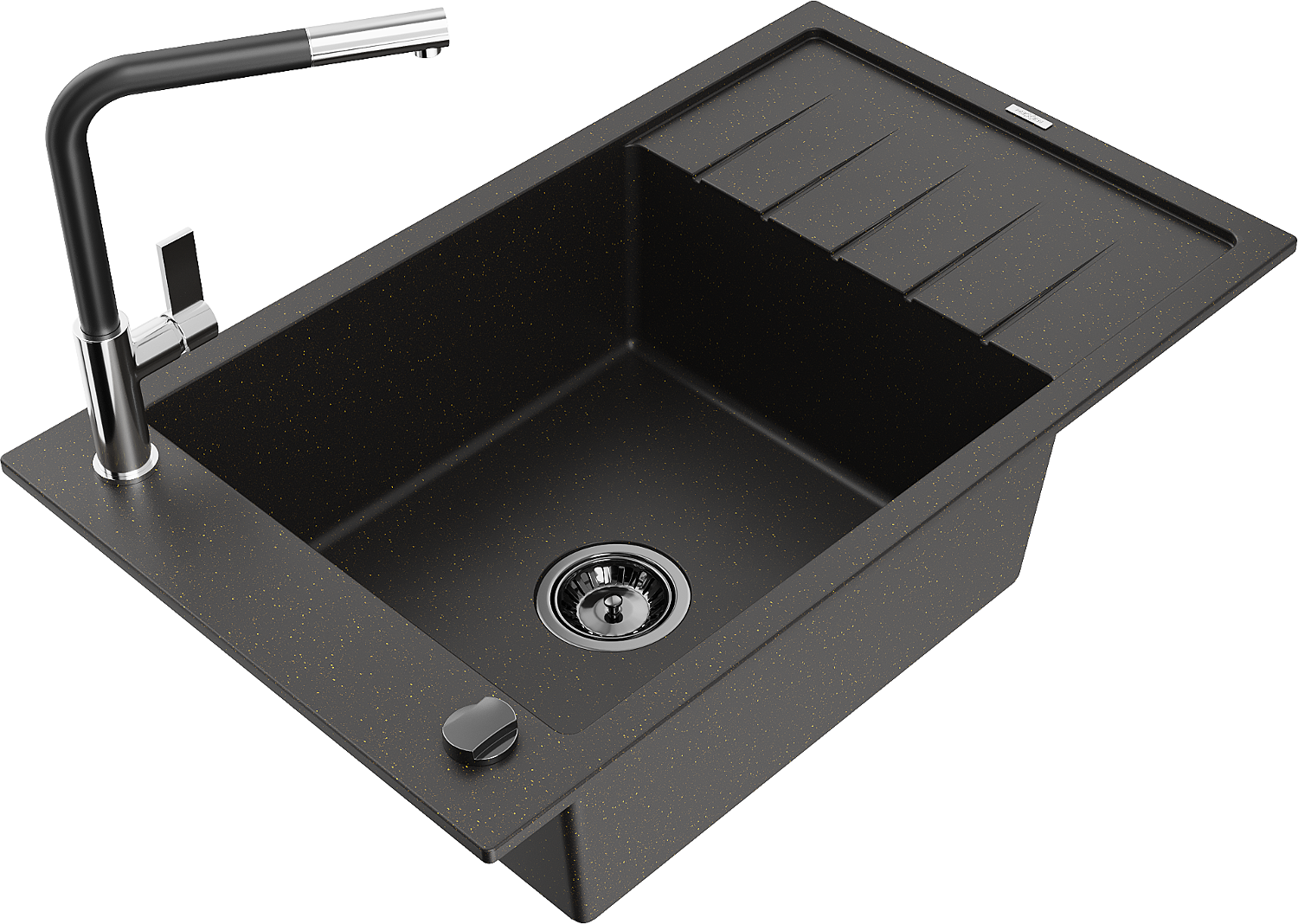 Mexen Elias 1 rekeszes gránit mosogató csepegtetővel és Flora konyhai csapteleppel, fekete/arany metál - 6511-75-670401-07-B