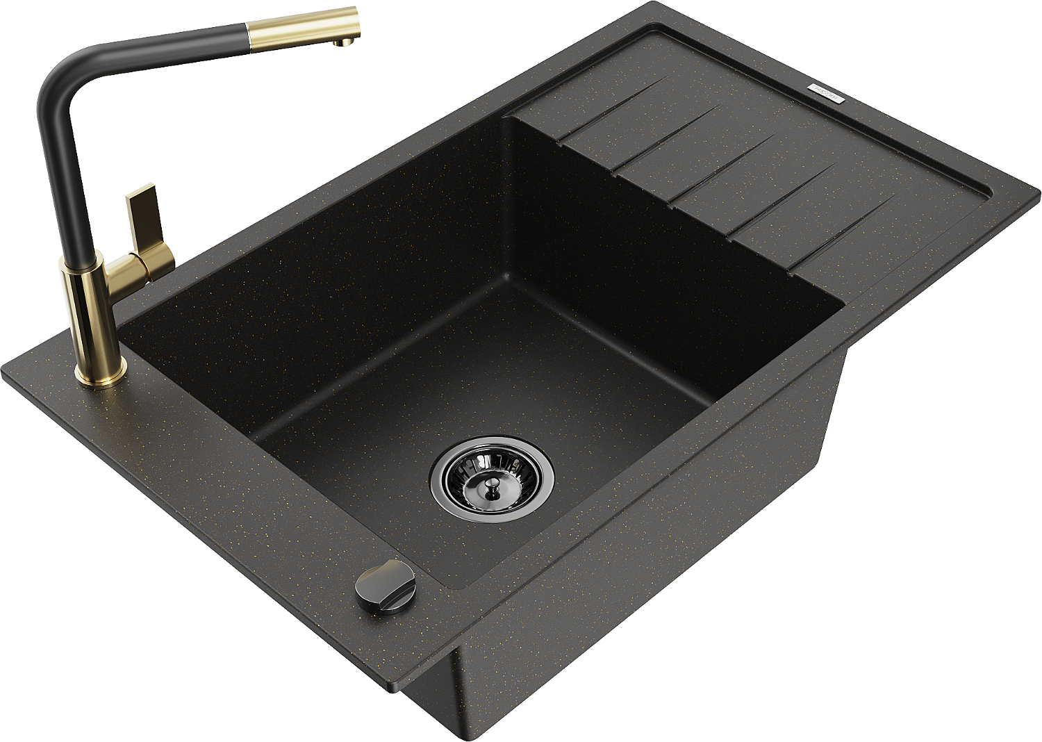 Mexen Elias egykamrás gránit mosogató csepegtetővel és Flora konyhai csapteleppel, fekete/arany metál - 6511-75-670401-57-B