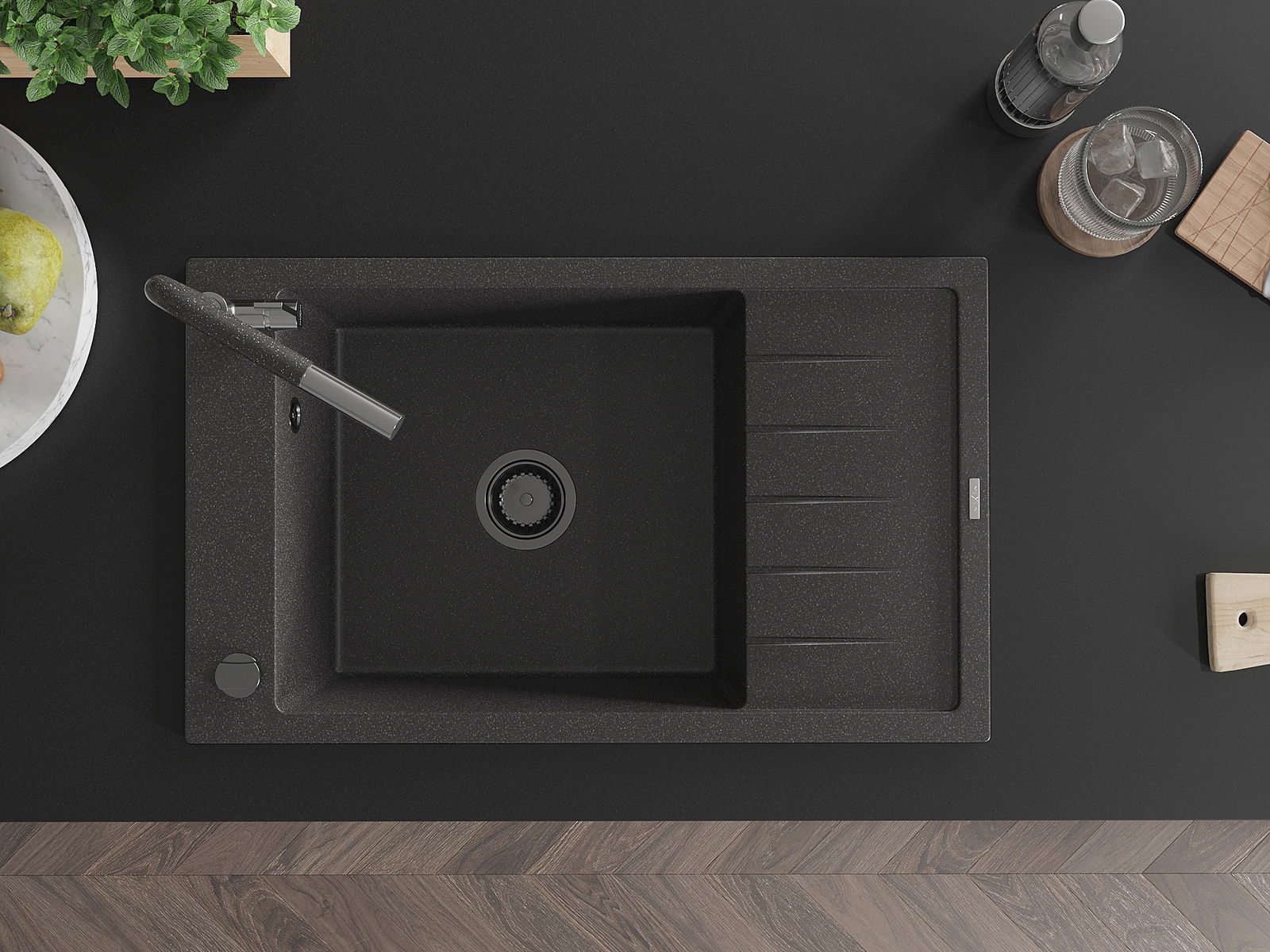 Mexen Elias 1-medencés gránit mosogató csepegtetővel és Flora konyhai csapteleppel, fekete pöttyös - 6511-76-670401-08-B