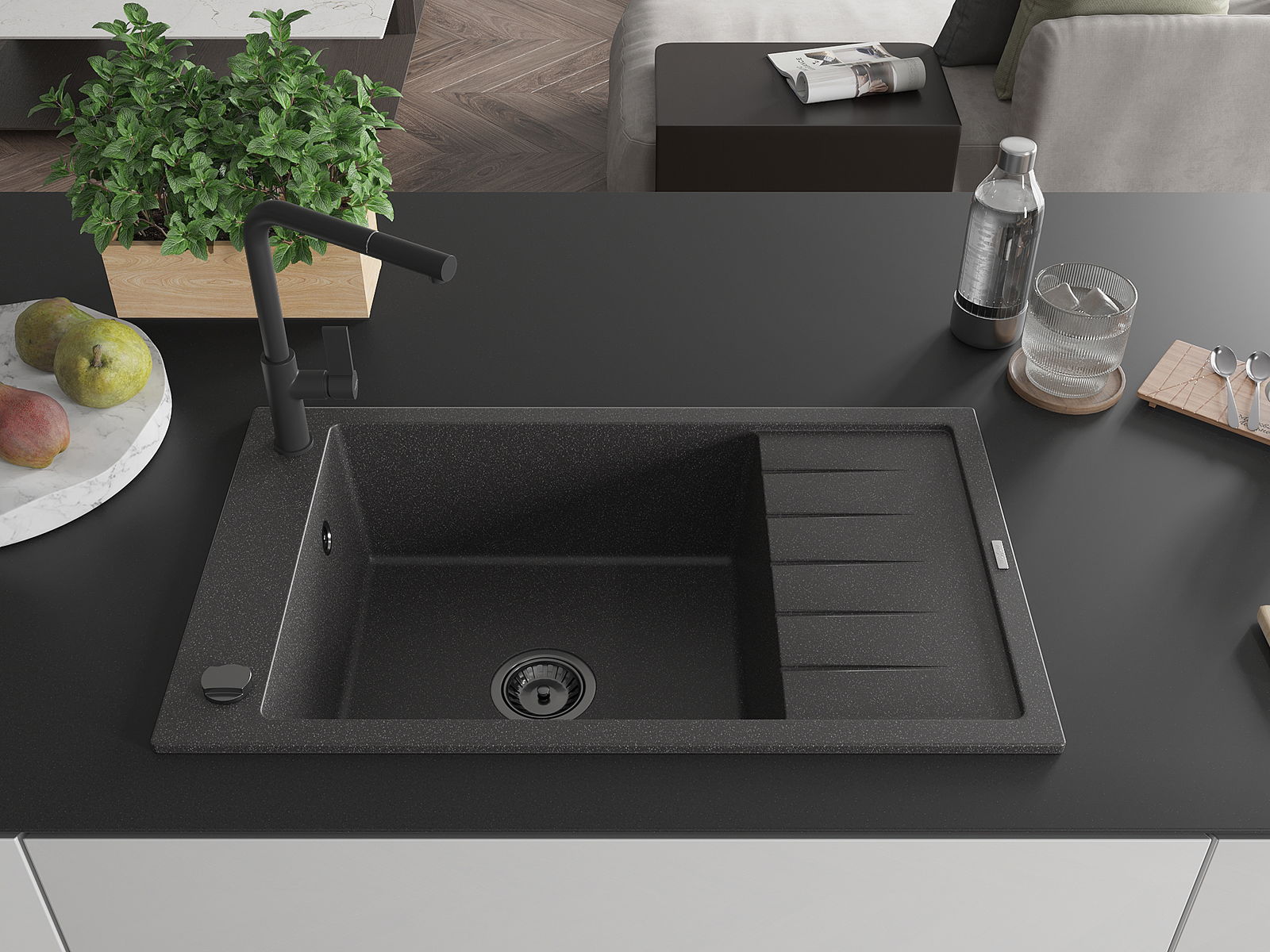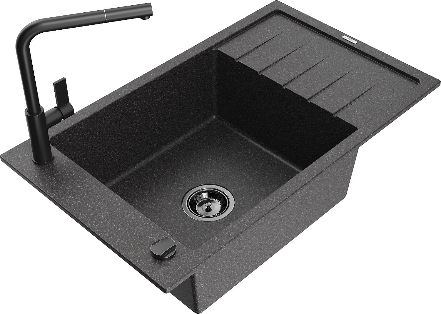 Mexen Elias egymedencés gránit mosogató csepegtetővel és Flora konyhai csappal, fekete szórt - 6511-76-670401-70-B