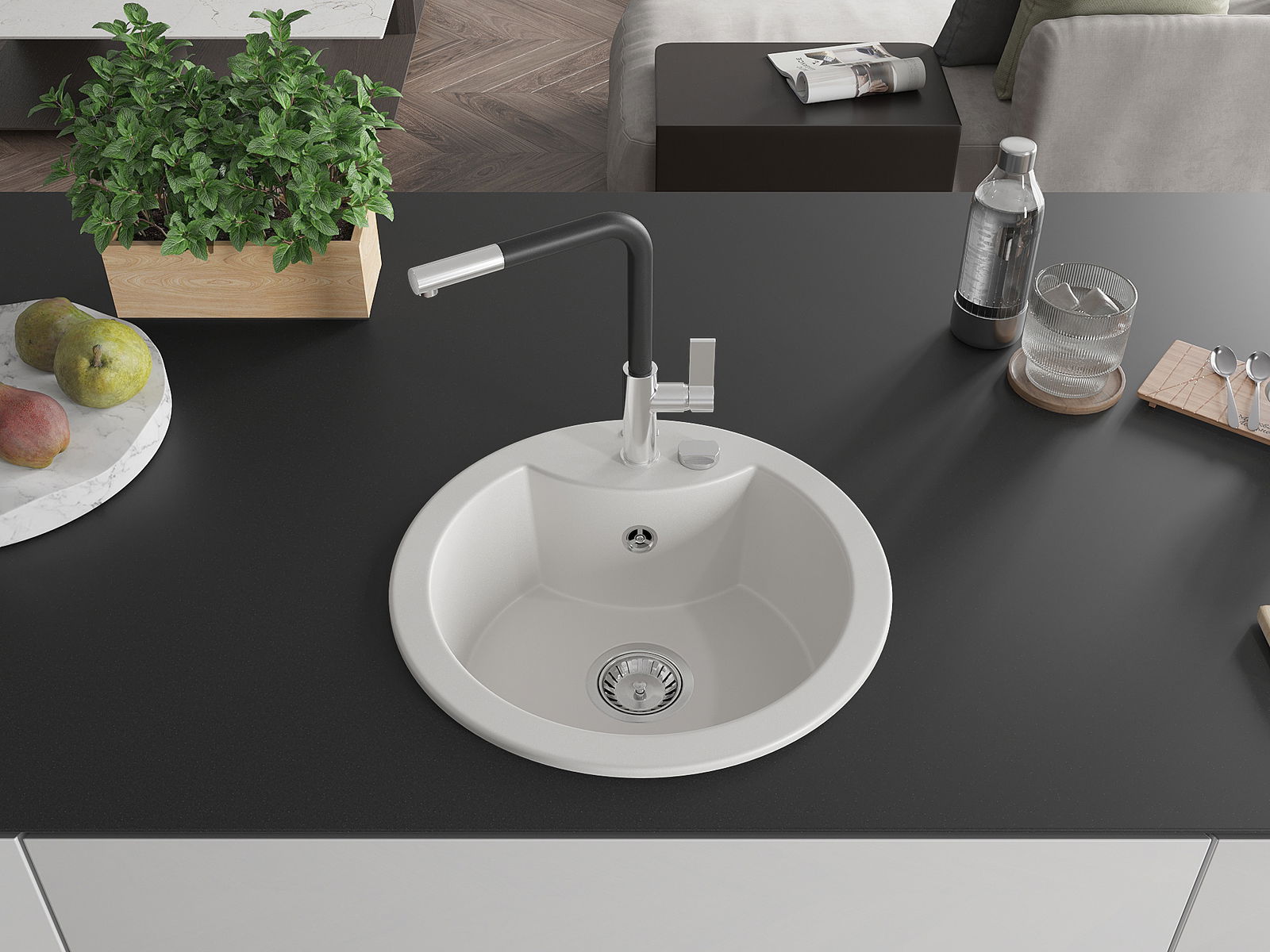 A mosogató kiváló minőségű gránitból készül. Ez egy elegáns és mindenekelőtt minden konyhához praktikus kiegészítés, stílusától függetlenül. A kiváló minőségű és a gránit tartósság biztosítja a sok éves használatát.
