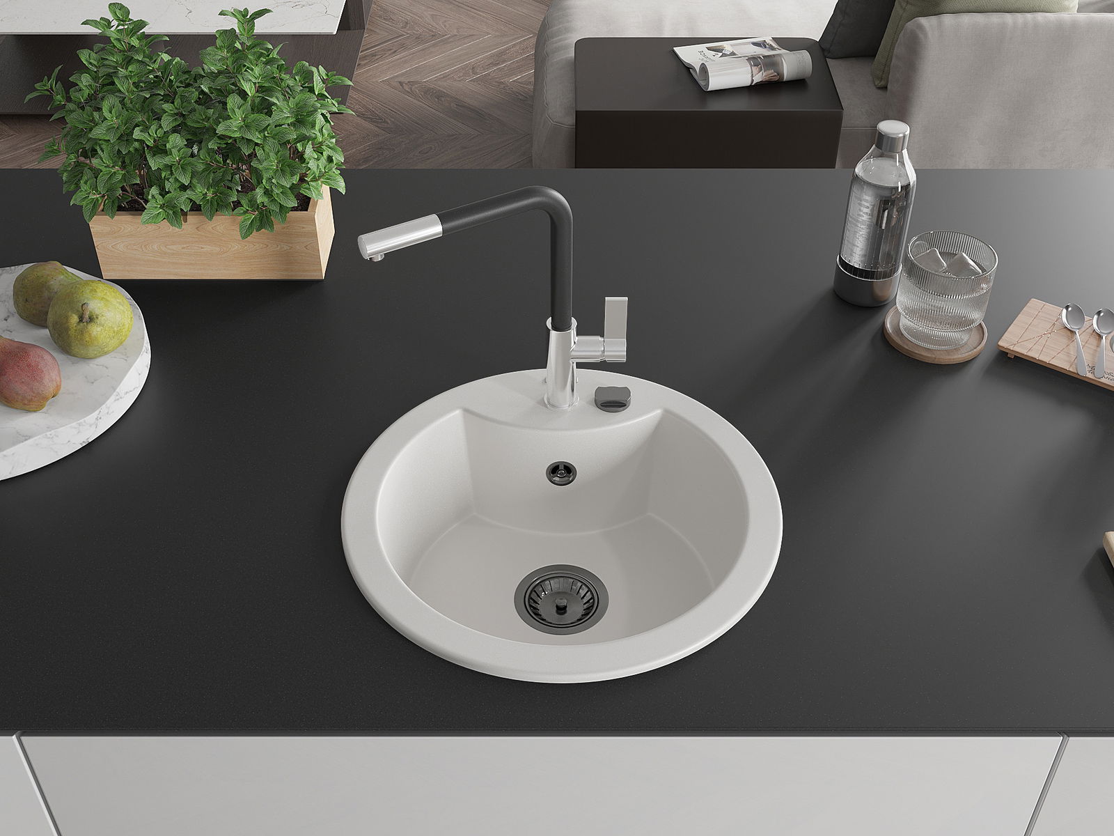 A mosogató kiváló minőségű gránitból készül. Ez egy elegáns és mindenekelőtt minden konyhához praktikus kiegészítés, stílusától függetlenül. A kiváló minőségű és a gránit tartósság biztosítja a sok éves használatát.