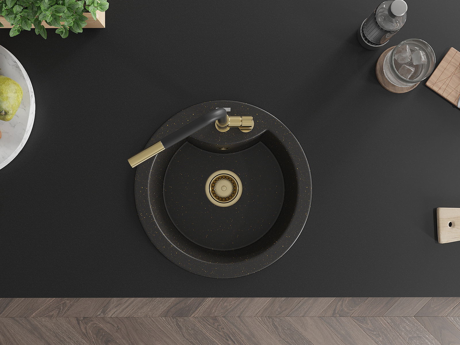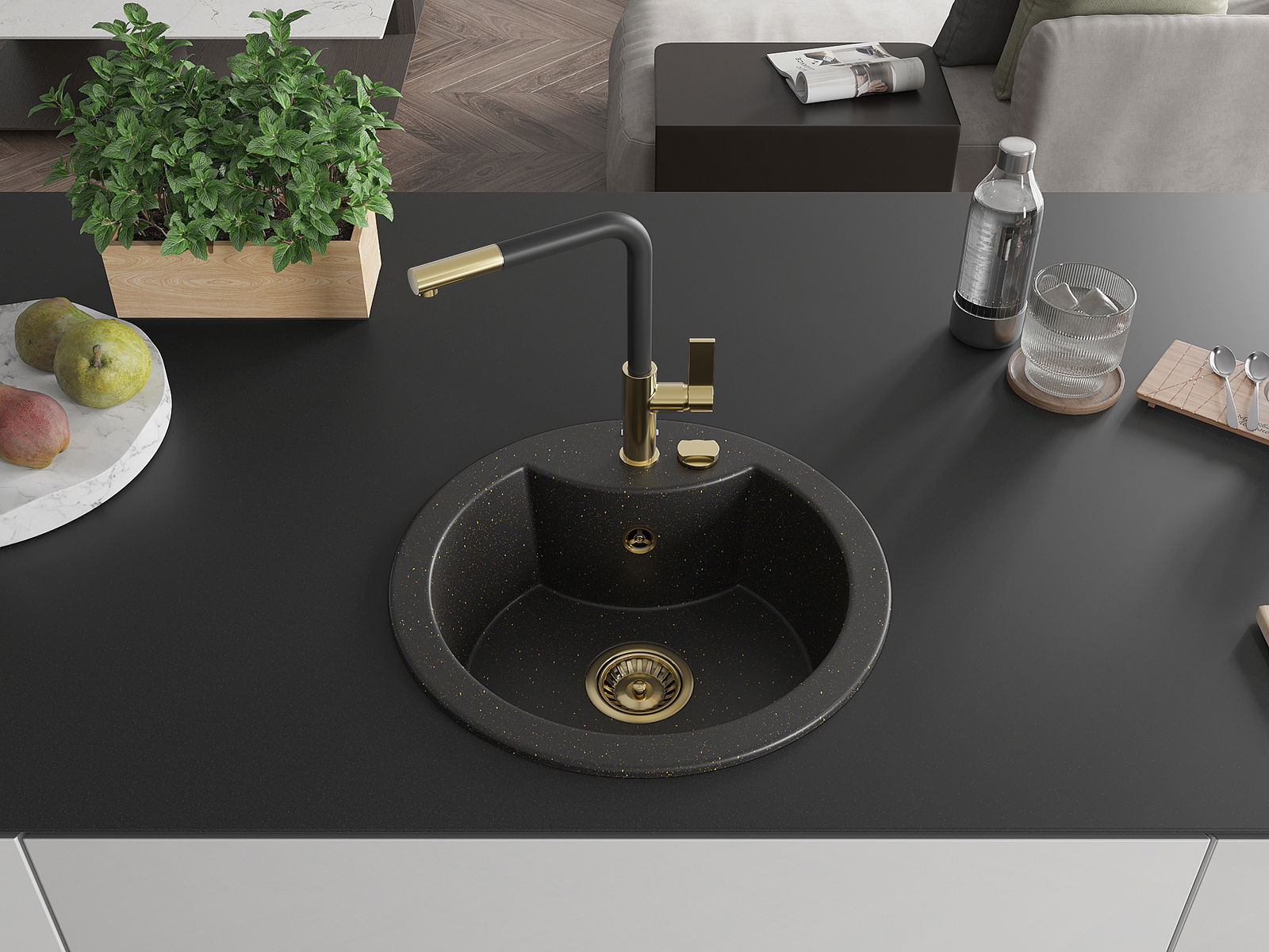 Mexen Diego egymedencés gránit mosogató Flora konyhai csapteleppel, fekete/arany metál - 6512-75-670401-57-G