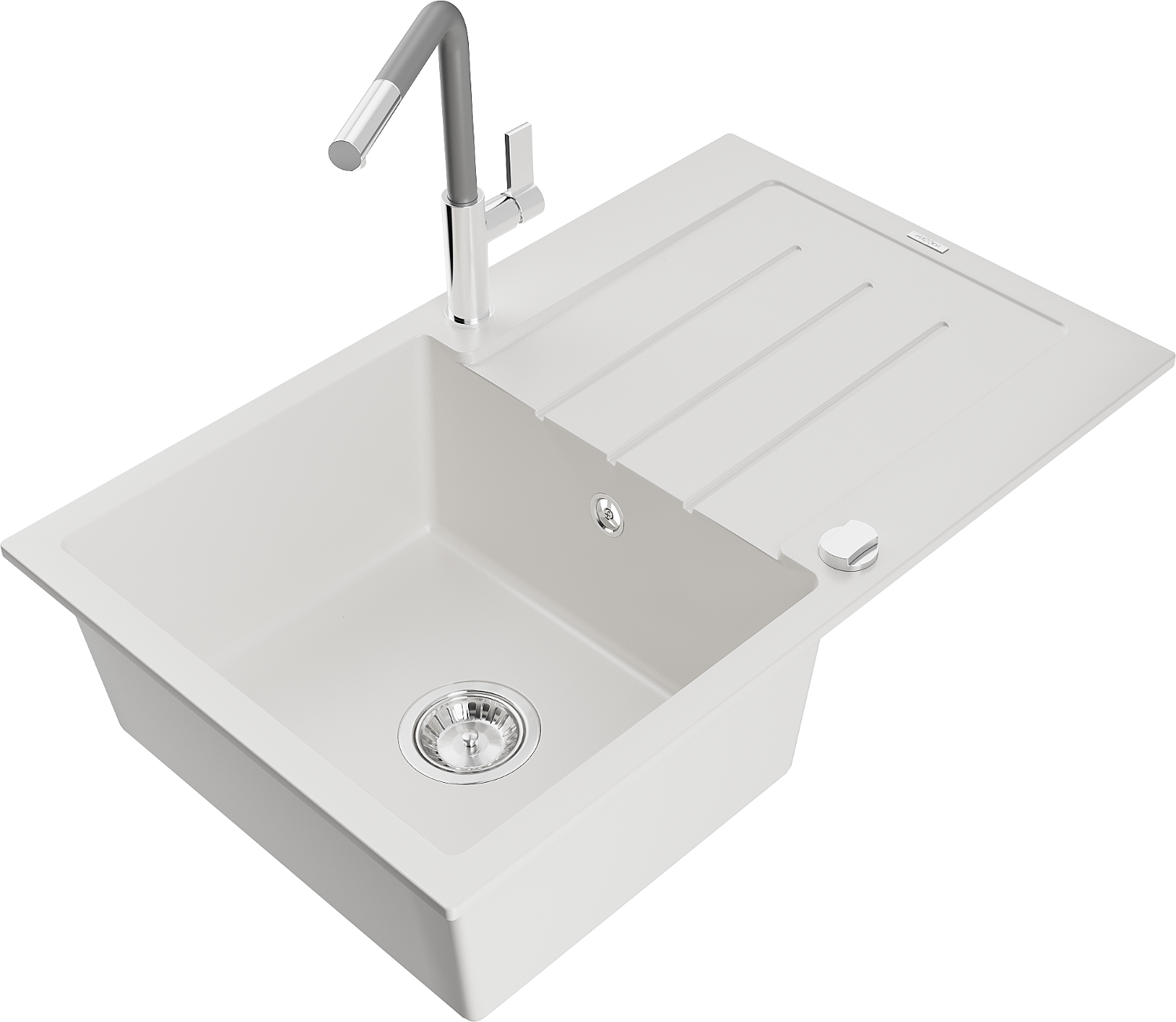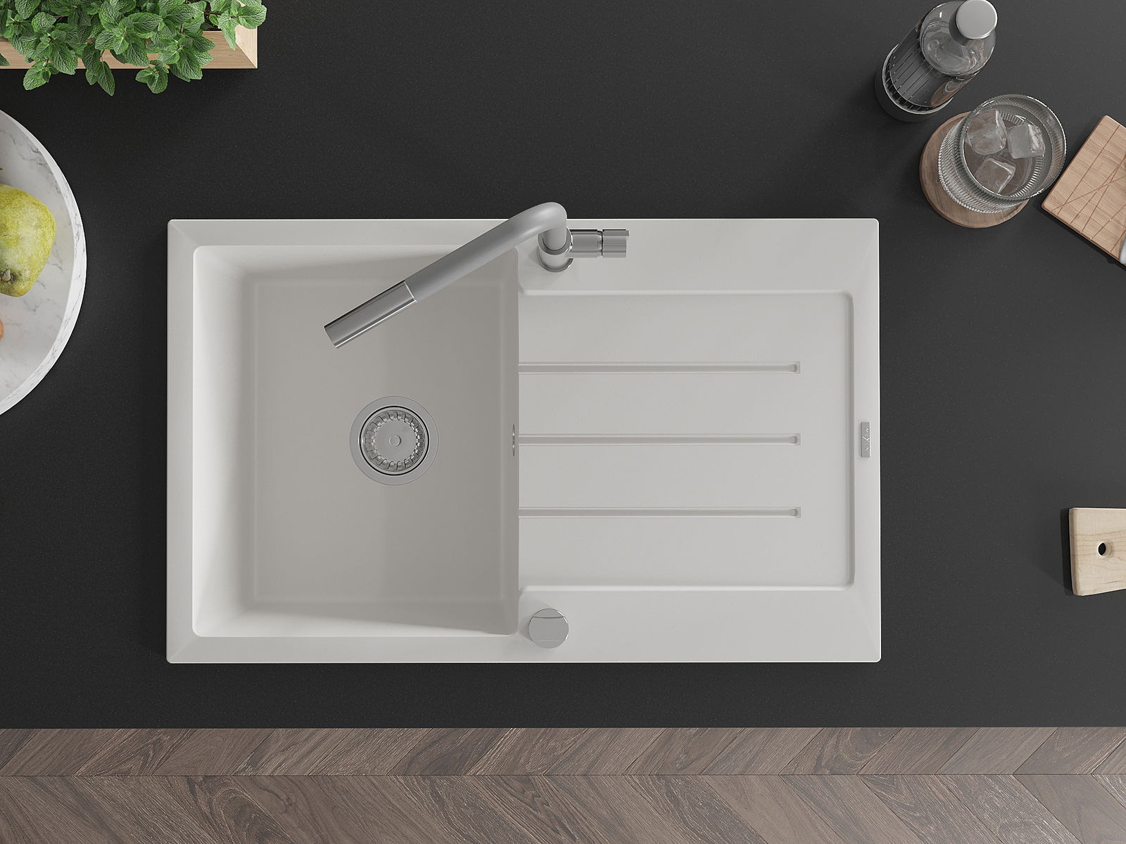 Mexen Bruno egymedencés gránit mosogató csepegtetővel és Flora konyhai csappal, fehér - 6513-20-670401-06