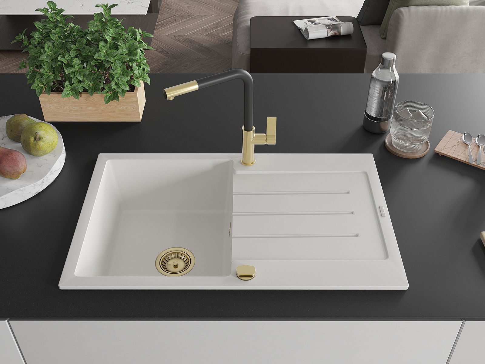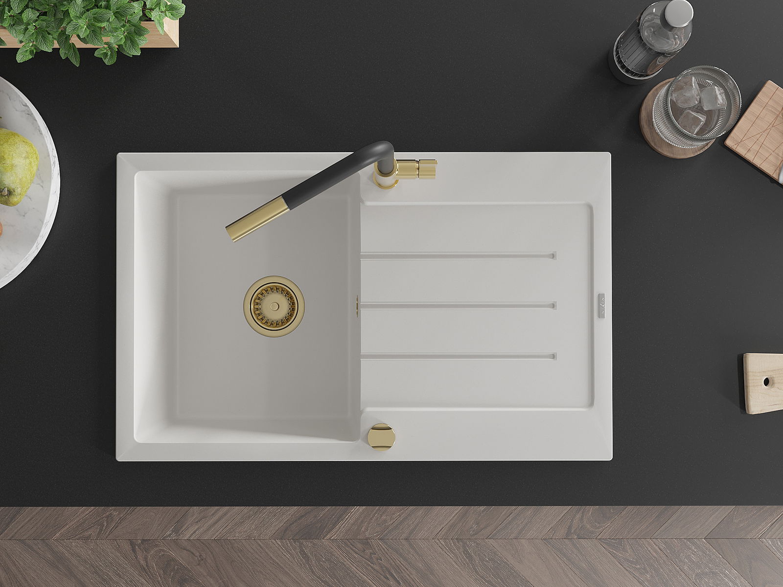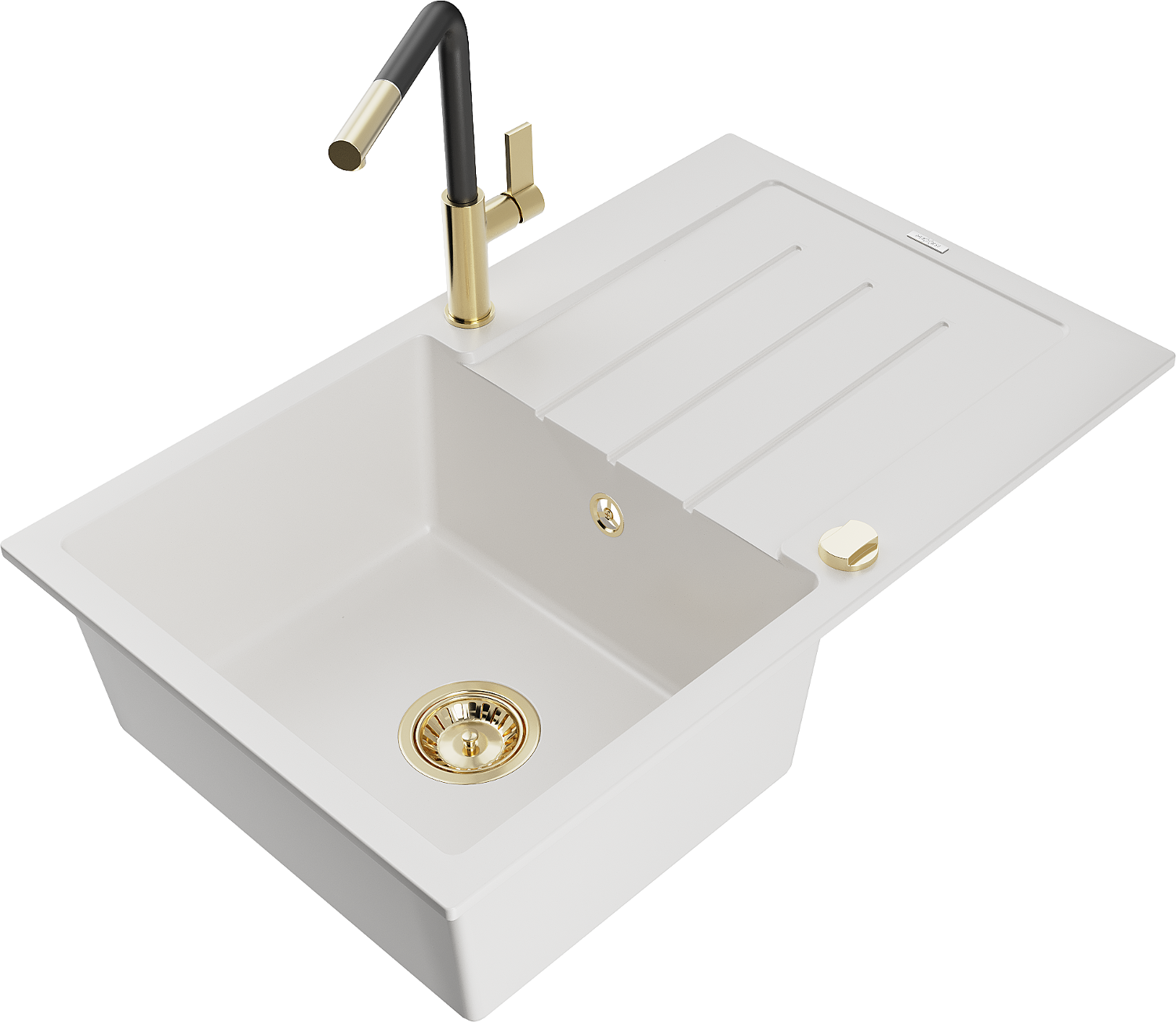Mexen Bruno egykamrás gránit mosogató csepegtetővel és Flora konyhai csapteleppel, fehér - 6513-20-670401-57-G