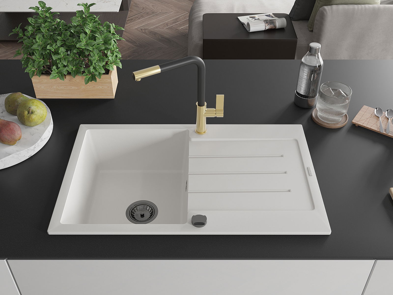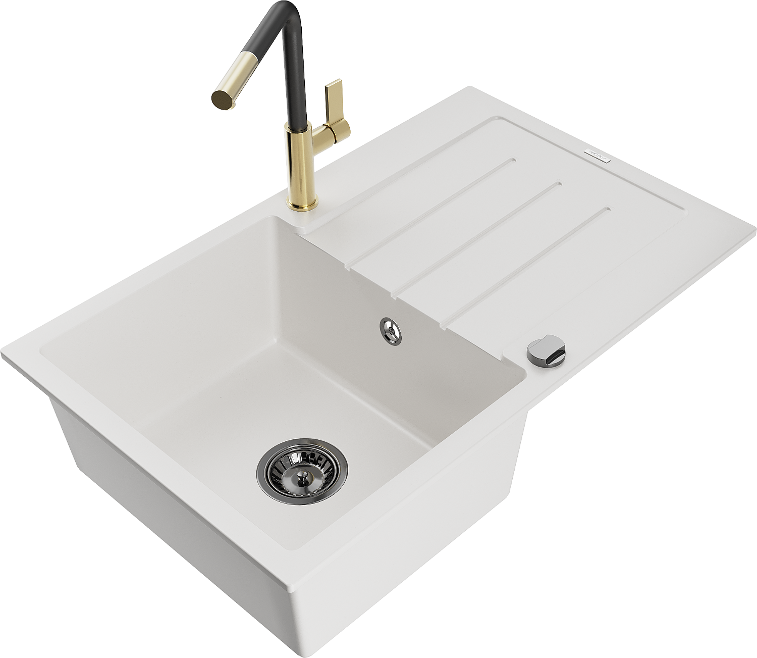 Mexen Bruno egymedencés gránit mosogató csepegtetővel és Flora konyhai csappal, fehér - 6513-20-670401-57-B