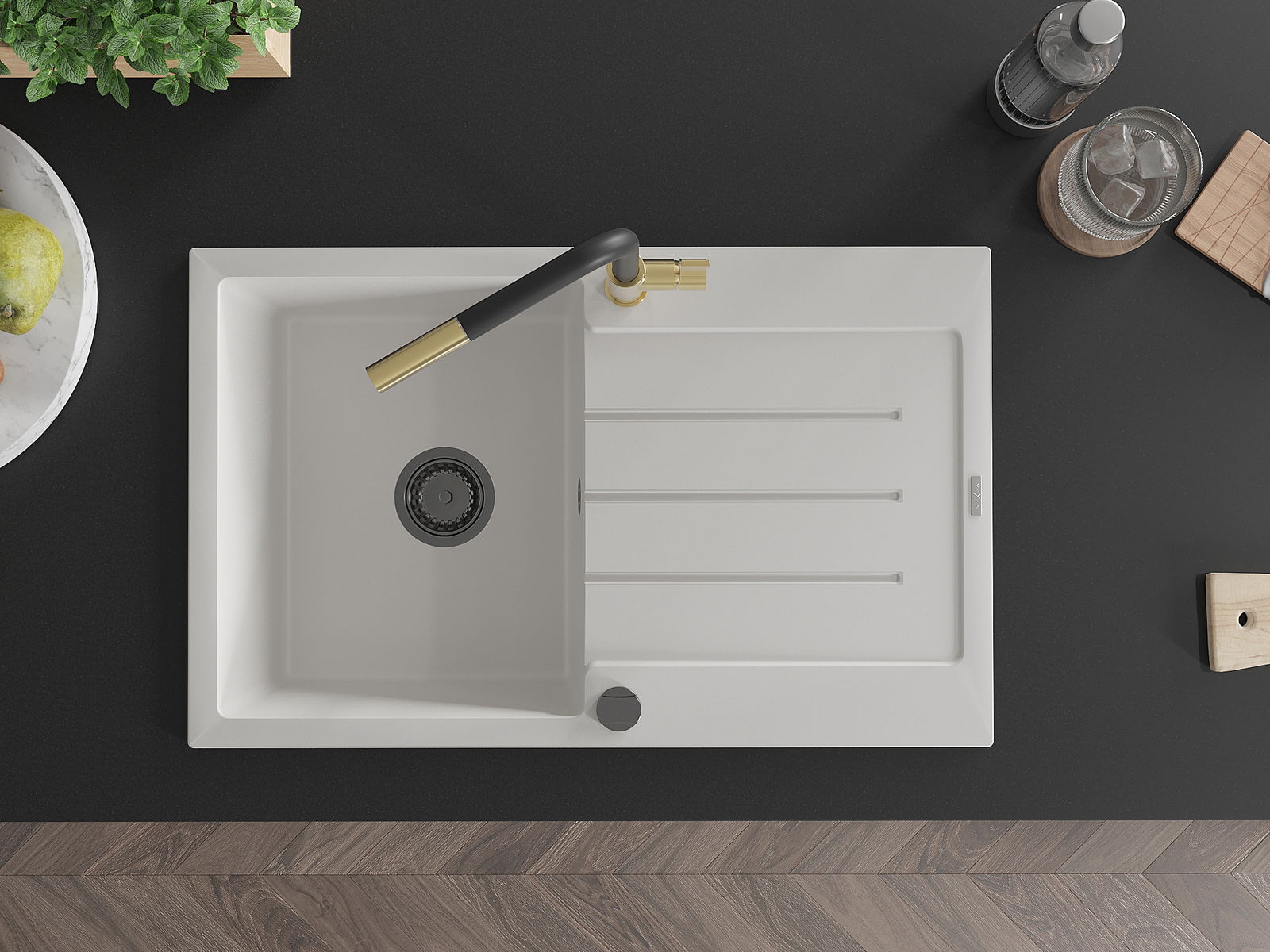 A mosogató kiváló minőségű gránitból készül. Ez egy elegáns és mindenekelőtt minden konyhához praktikus kiegészítés, stílusától függetlenül. A kiváló minőségű és a gránit tartósság biztosítja a sok éves használatát.