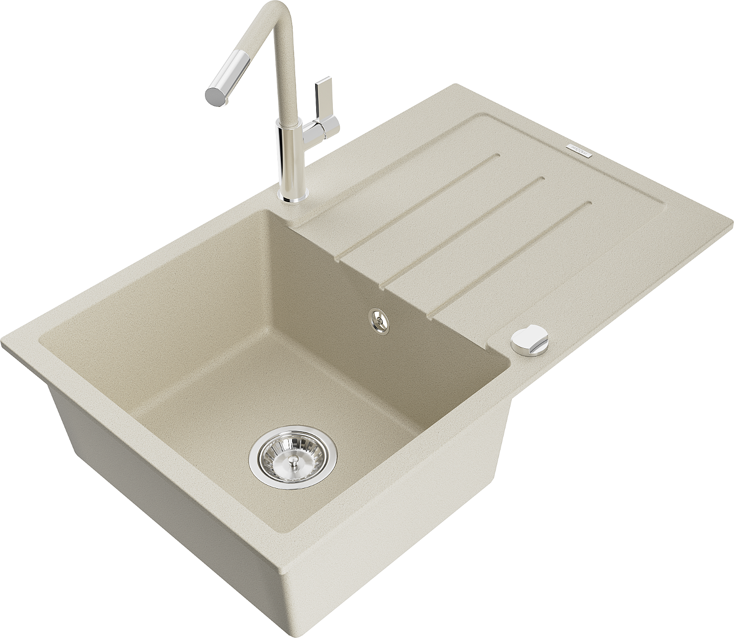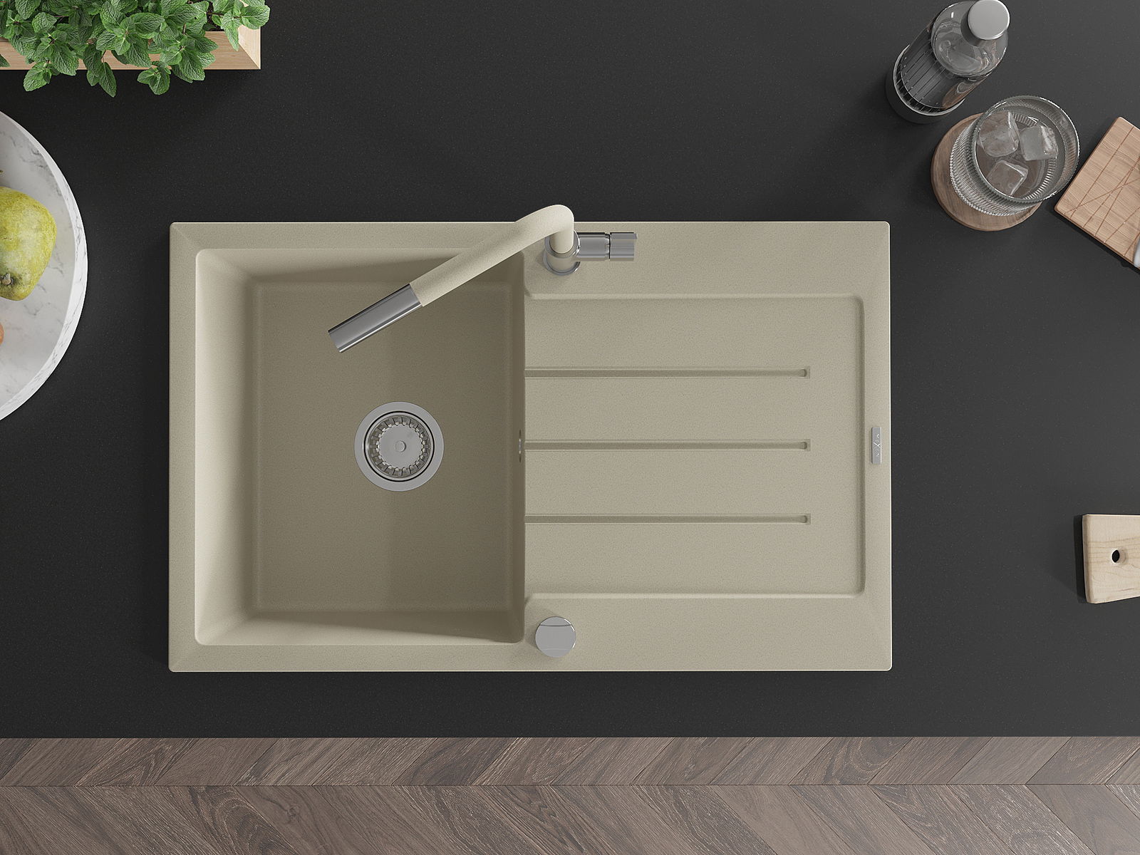 Mexen Bruno 1-medencés gránit mosogató csepegtetővel és Flora konyhai csappal, bézs - 6513-69-670401-09