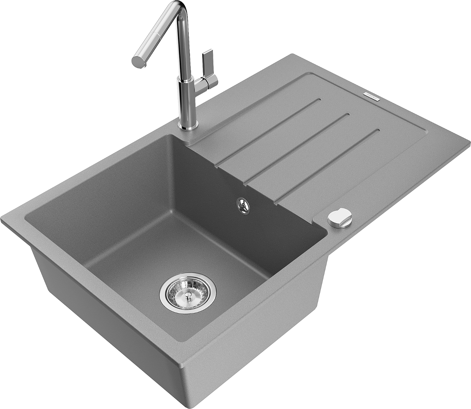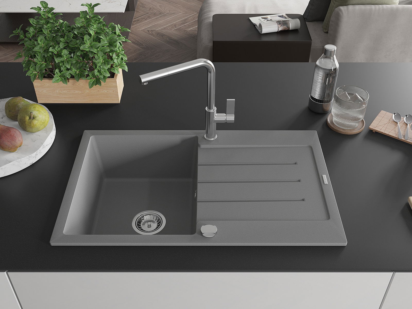 Mexen Bruno egymedencés gránit mosogató csepegtetővel és Flora konyhai csapteleppel, szürke - 6513-71-670401-00