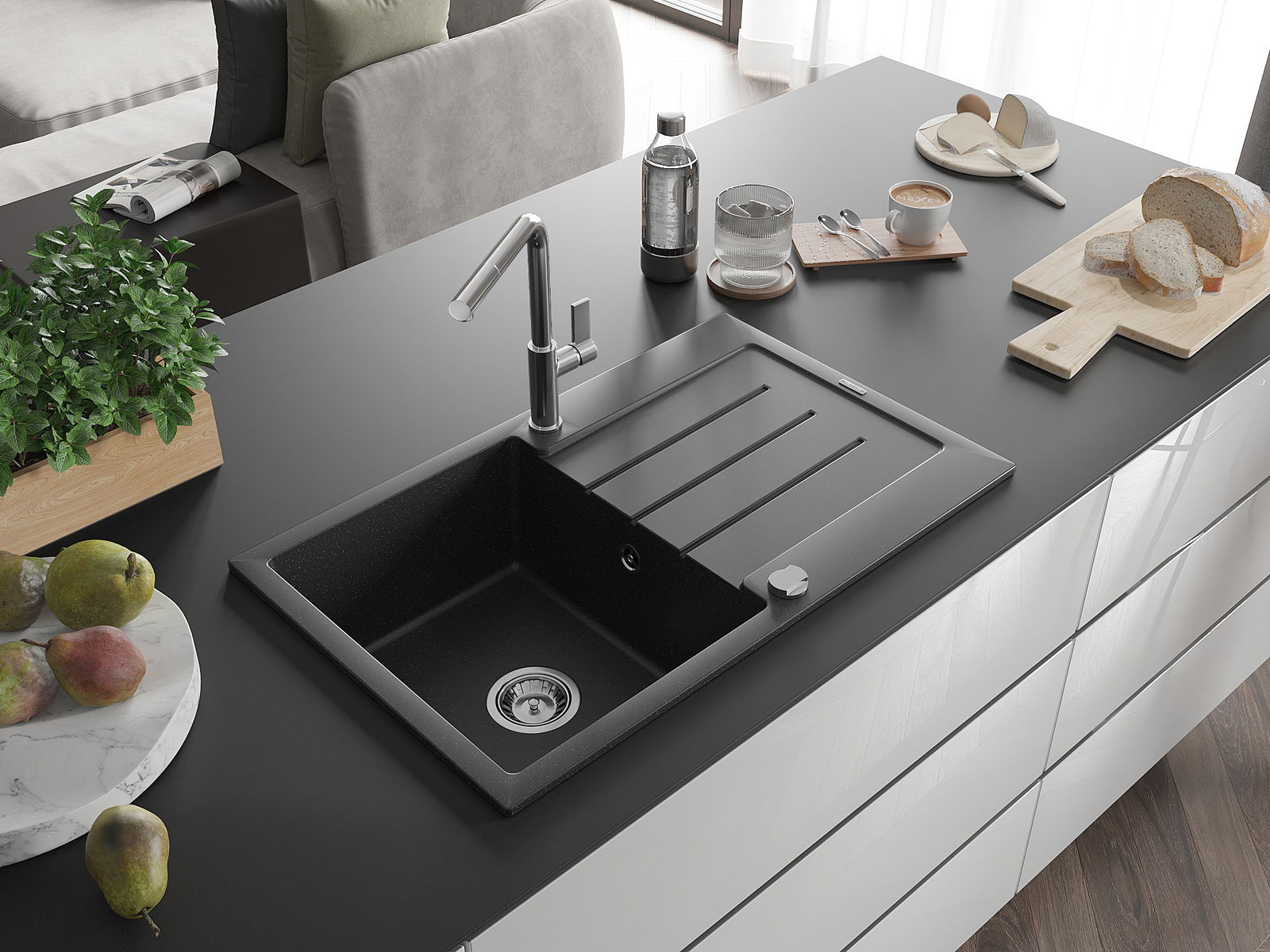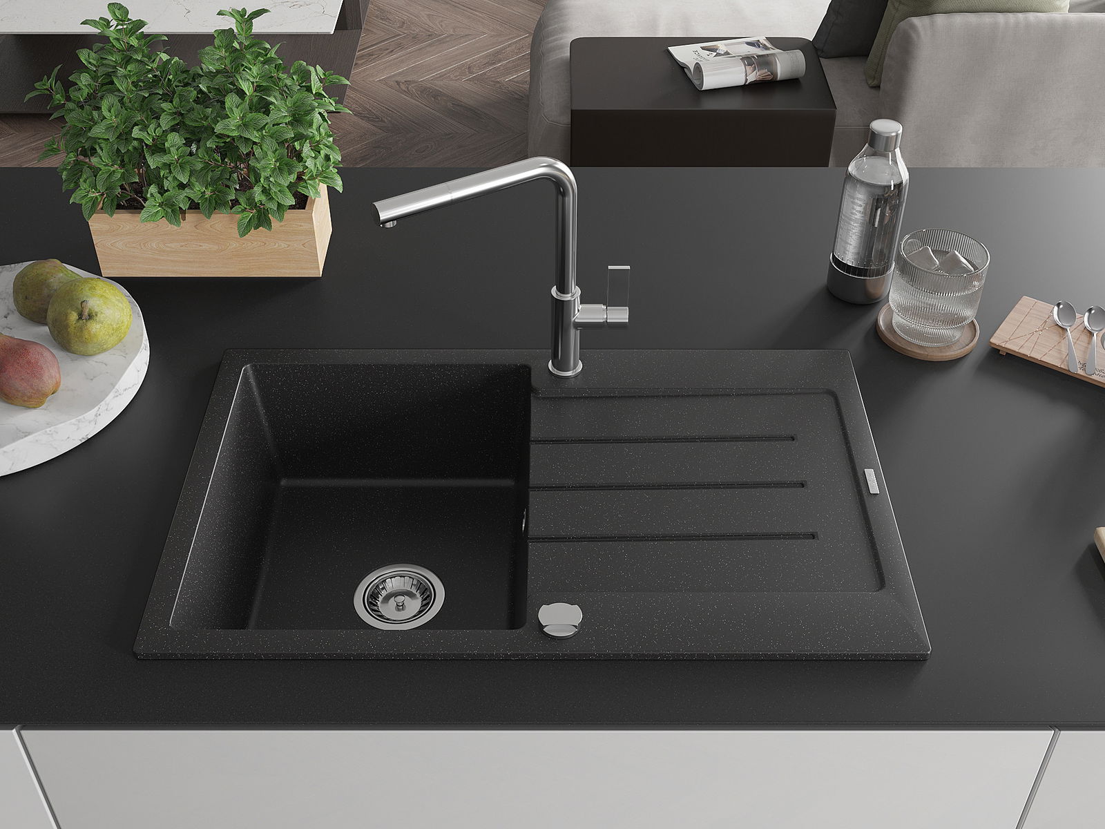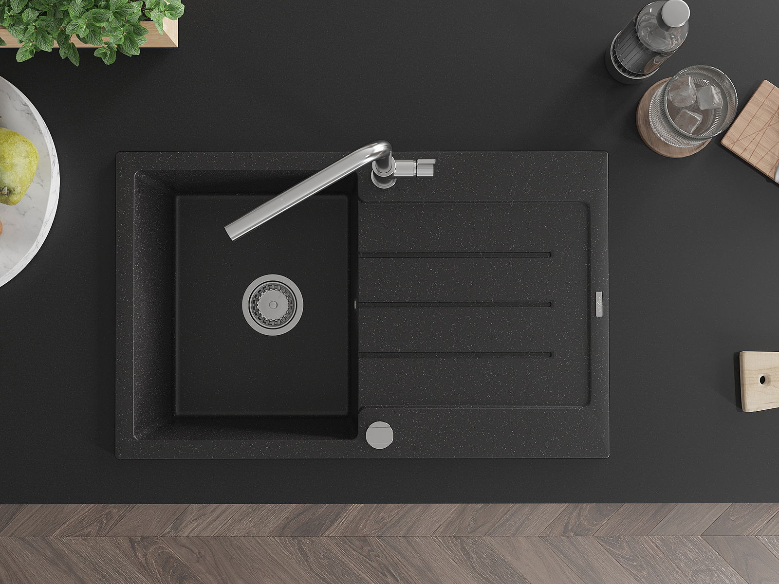 A mosogató kiváló minőségű gránitból készül. Ez egy elegáns és mindenekelőtt minden konyhához praktikus kiegészítés, stílusától függetlenül. A kiváló minőségű és a gránit tartósság biztosítja a sok éves használatát.