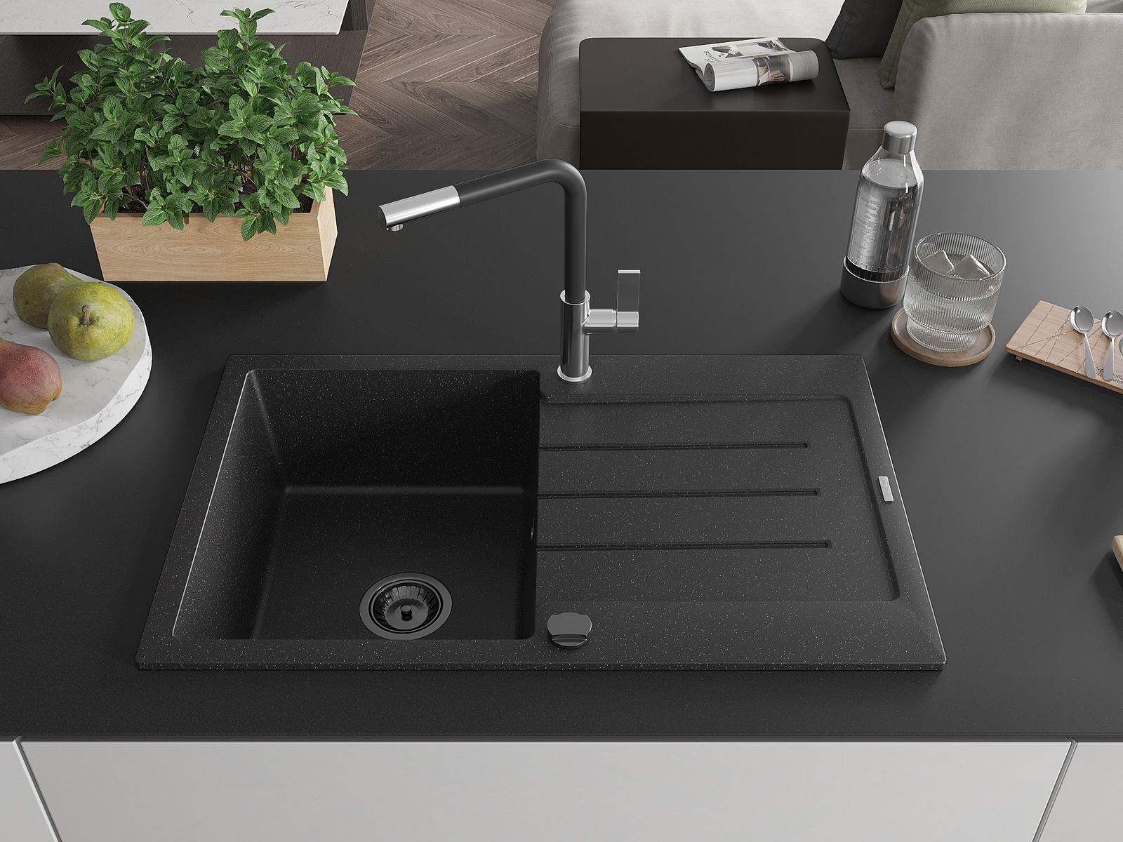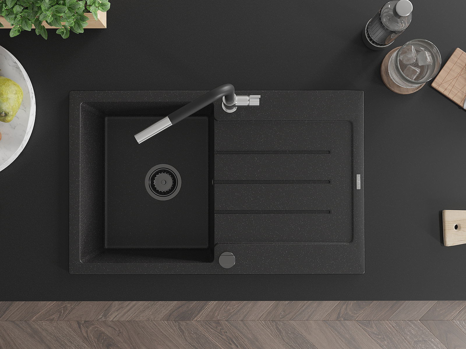 A mosogató kiváló minőségű gránitból készül. Ez egy elegáns és mindenekelőtt minden konyhához praktikus kiegészítés, stílusától függetlenül. A kiváló minőségű és a gránit tartósság biztosítja a sok éves használatát.