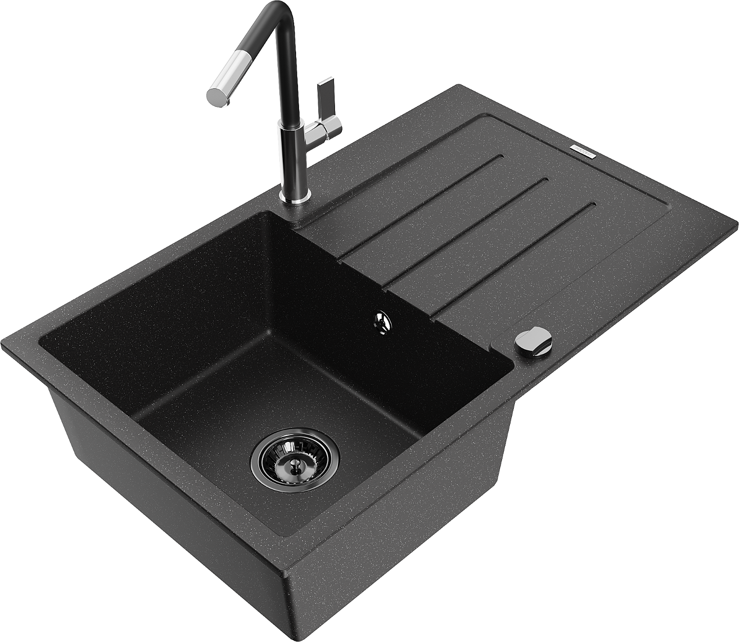 Mexen Bruno egymedencés, csepegtetős gránitmosogató és Flora konyhai csaptelep, fekete/ezüst metál - 6513-73-670401-07-B