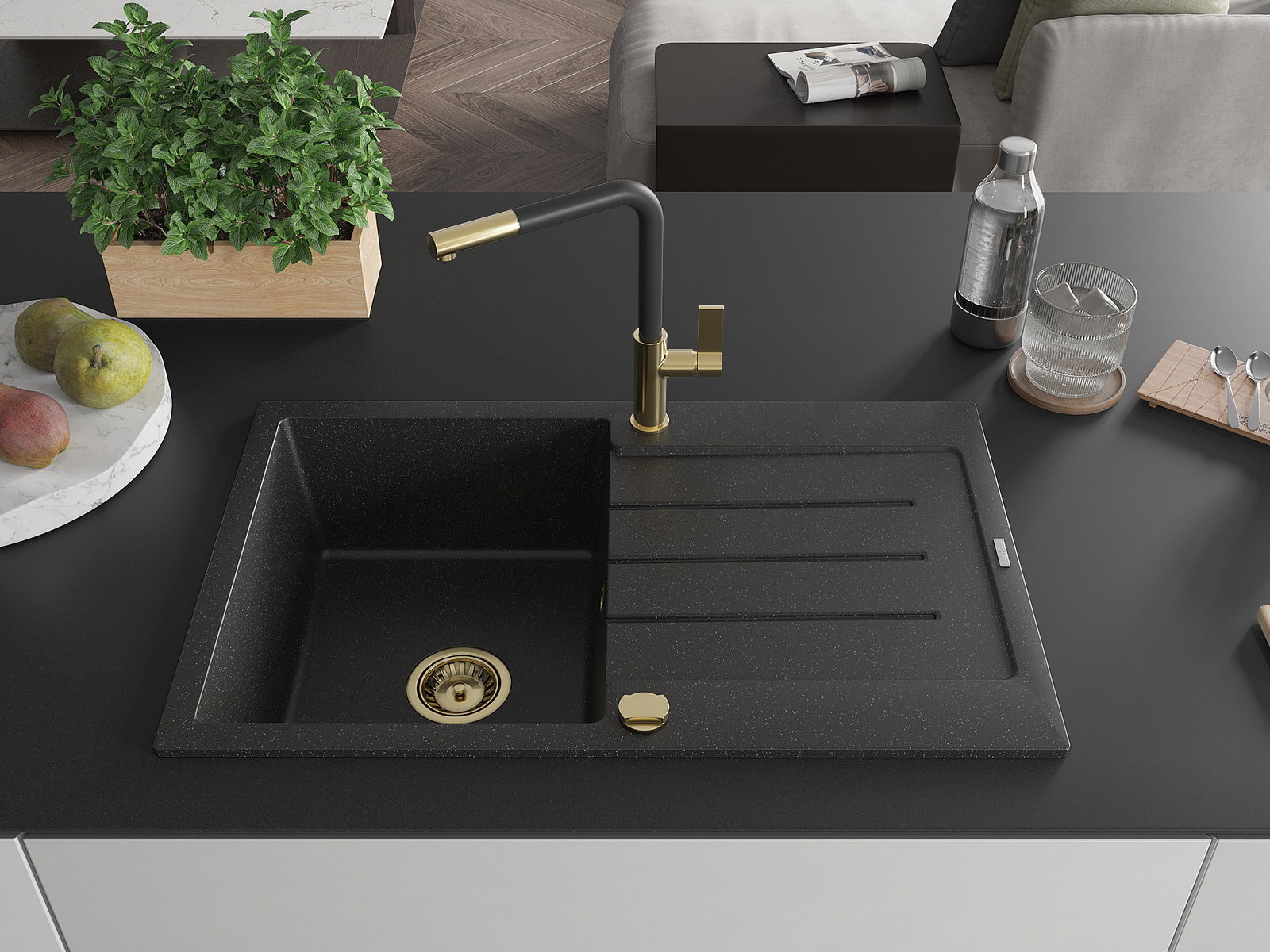 A mosogató kiváló minőségű gránitból készül. Ez egy elegáns és mindenekelőtt minden konyhához praktikus kiegészítés, stílusától függetlenül. A kiváló minőségű és a gránit tartósság biztosítja a sok éves használatát.