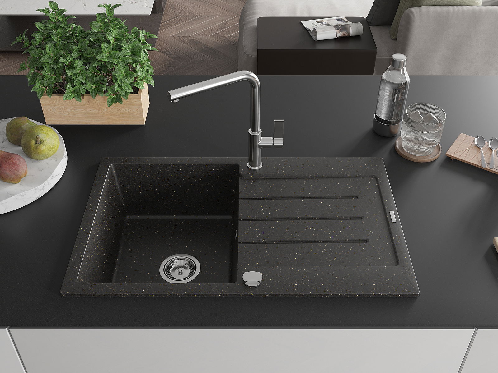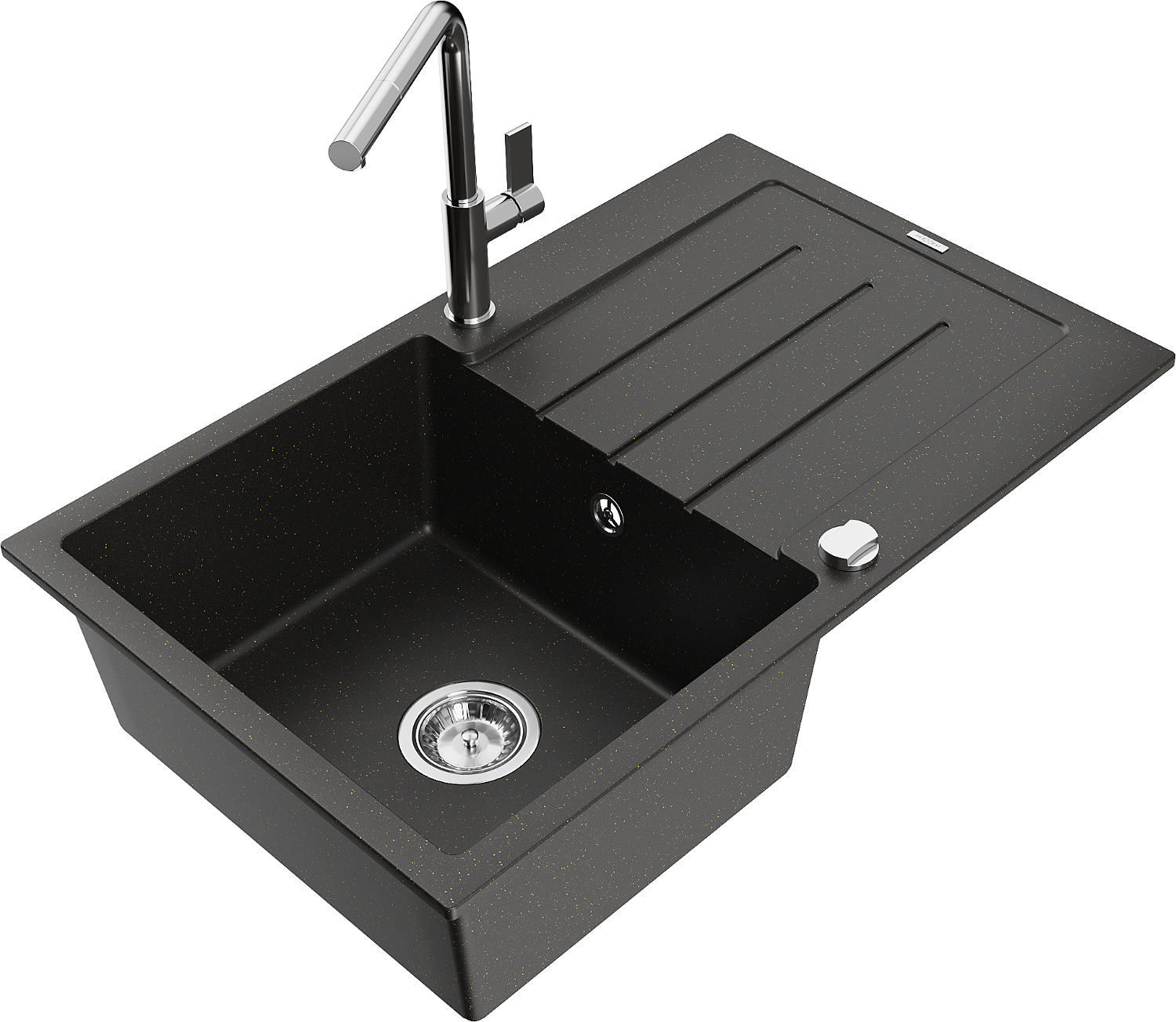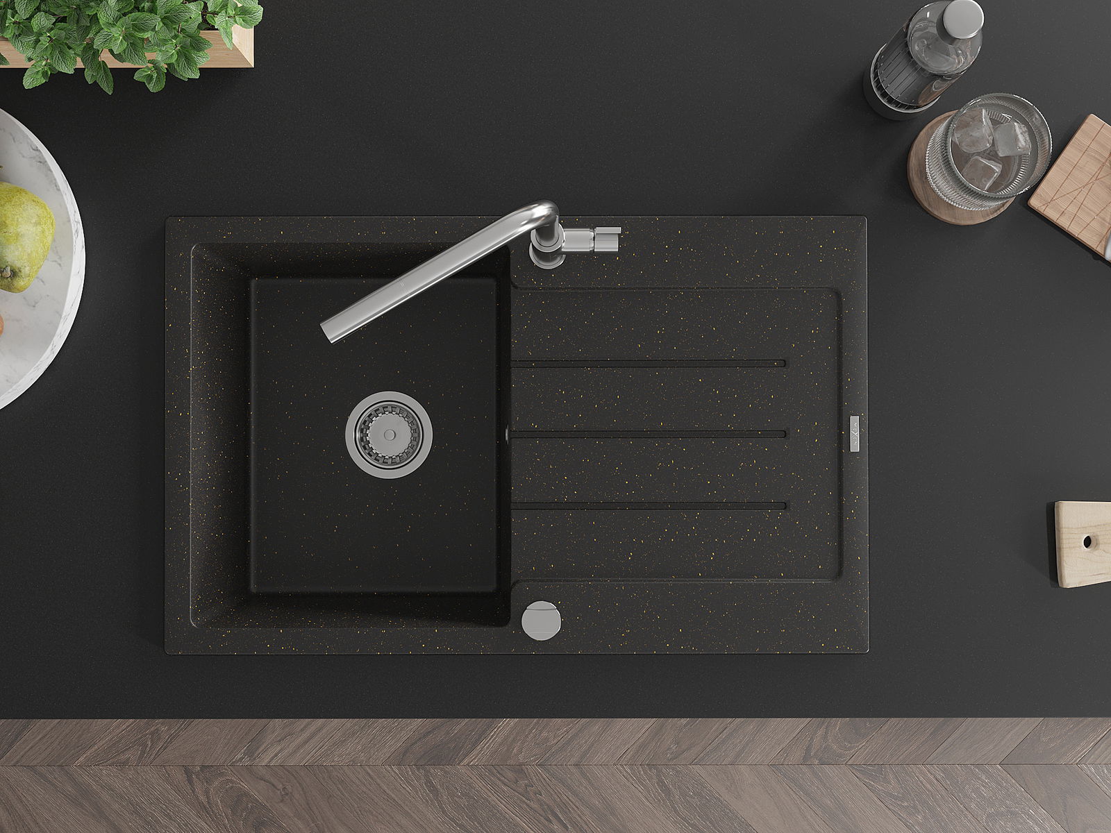 A mosogató magas minőségű gránitból készült. Elegáns, de mindenekelőtt praktikus kiegészítője minden konyhának, függetlenül annak stílusától. A gránit magas minősége és tartóssága hosszú távú használatot biztosít.