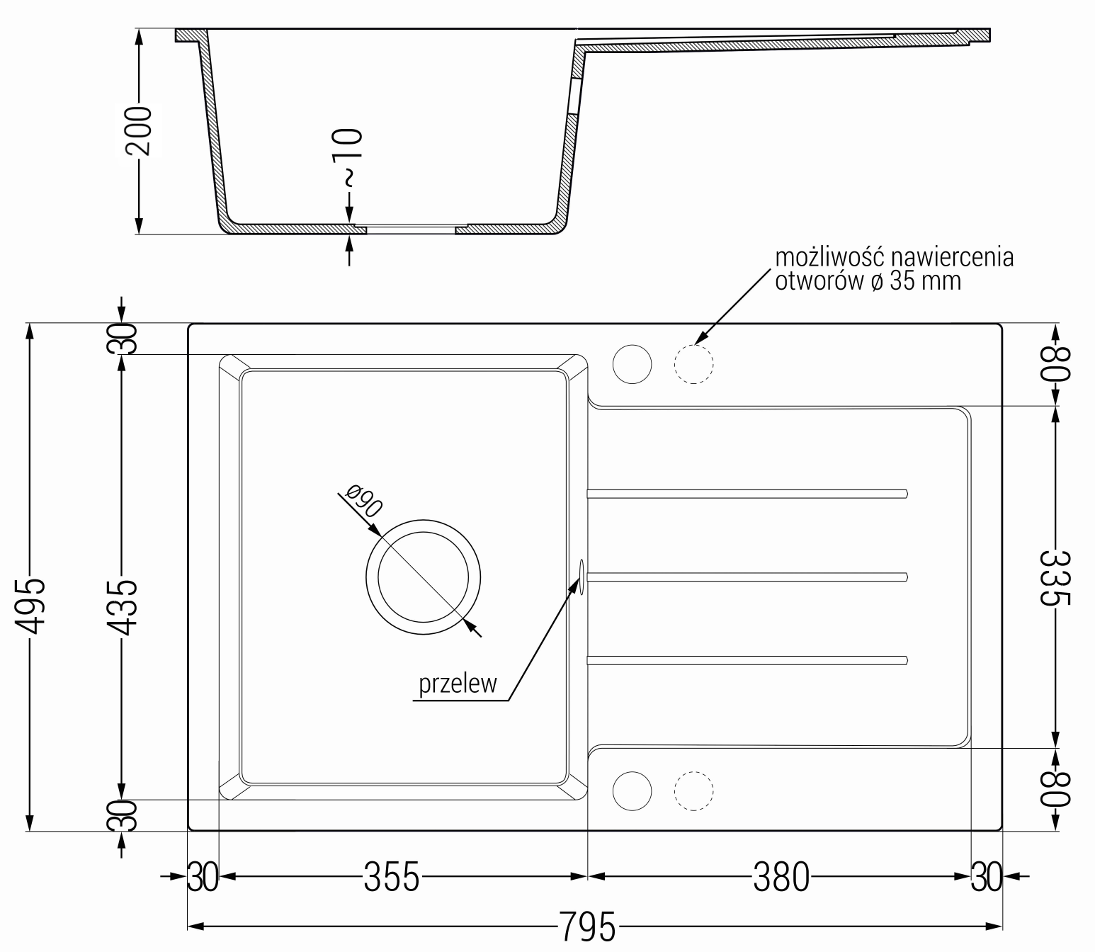 A mosogató 2 előfúrt, 35 mm átmérőjű nyílással rendelkezik, amelyeket saját kezűleg lehet kivágni. Ezek többek között felhasználhatók folyékony adagoló felszerelésére, amely megszünteti a műanyag palackok jelenlétét a konyhában, és elegáns befejezést kölcsönöz neki.