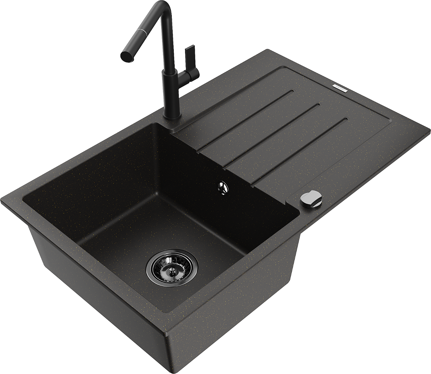 Mexen Bruno egymedencés gránit mosogató csepegtetővel és Flora konyhai csapteleppel, fekete/arany metál - 6513-75-670401-70-B