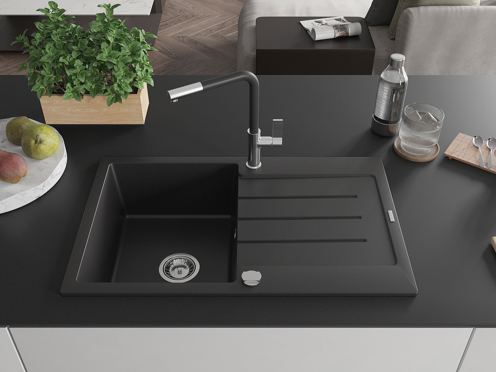 A mosogató magas minőségű gránitból készült. Elegáns, de mindenekelőtt praktikus kiegészítője minden konyhának, függetlenül annak stílusától. A gránit magas minősége és tartóssága hosszú távú használatot biztosít.