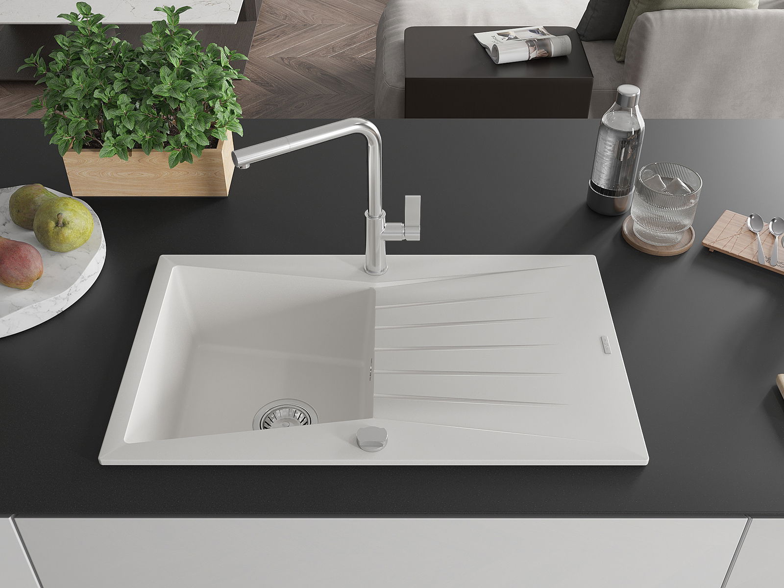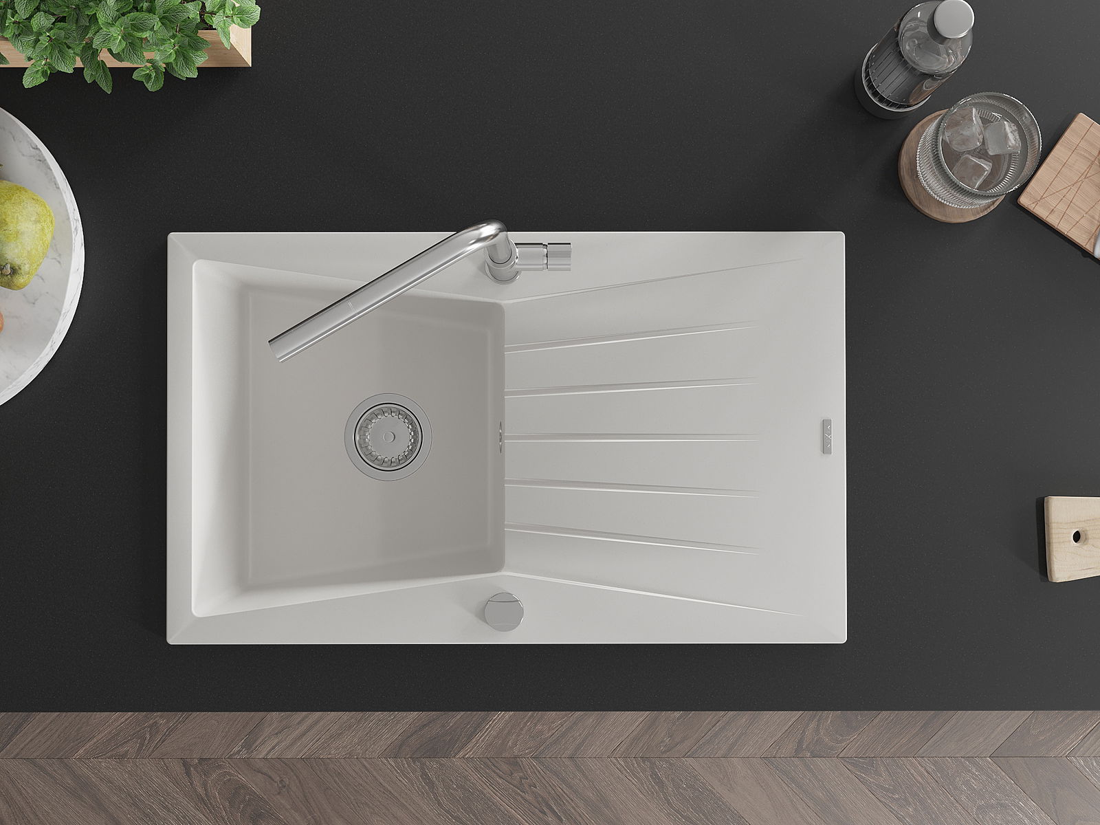 A mosogató magas minőségű gránitból készült. Elegáns, de mindenekelőtt praktikus kiegészítője minden konyhának, függetlenül annak stílusától. A gránit magas minősége és tartóssága hosszú távú használatot biztosít.