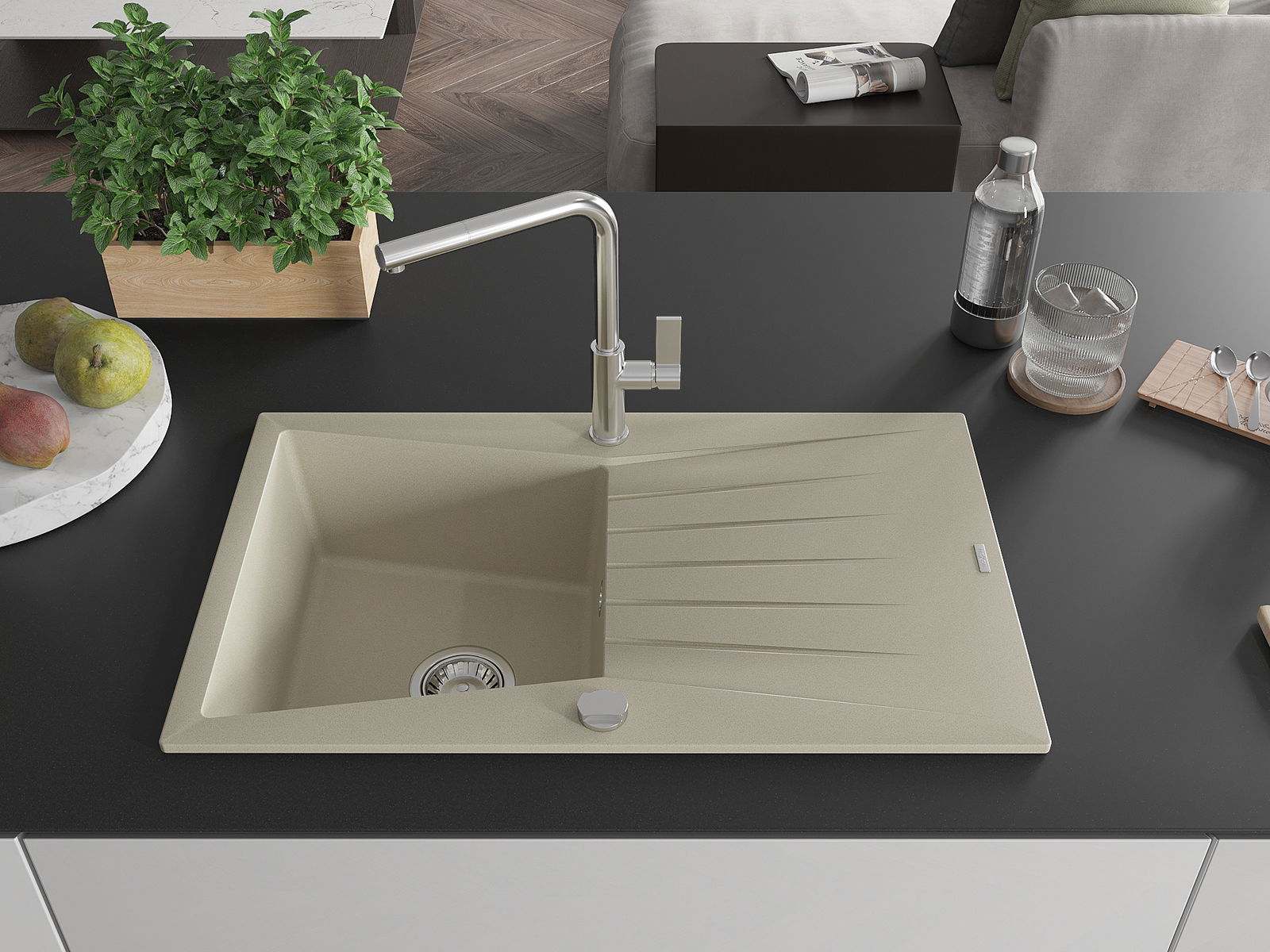 A mosogató magas minőségű gránitból készült. Elegáns, de mindenekelőtt praktikus kiegészítője minden konyhának, függetlenül annak stílusától. A gránit magas minősége és tartóssága hosszú távú használatot biztosít.