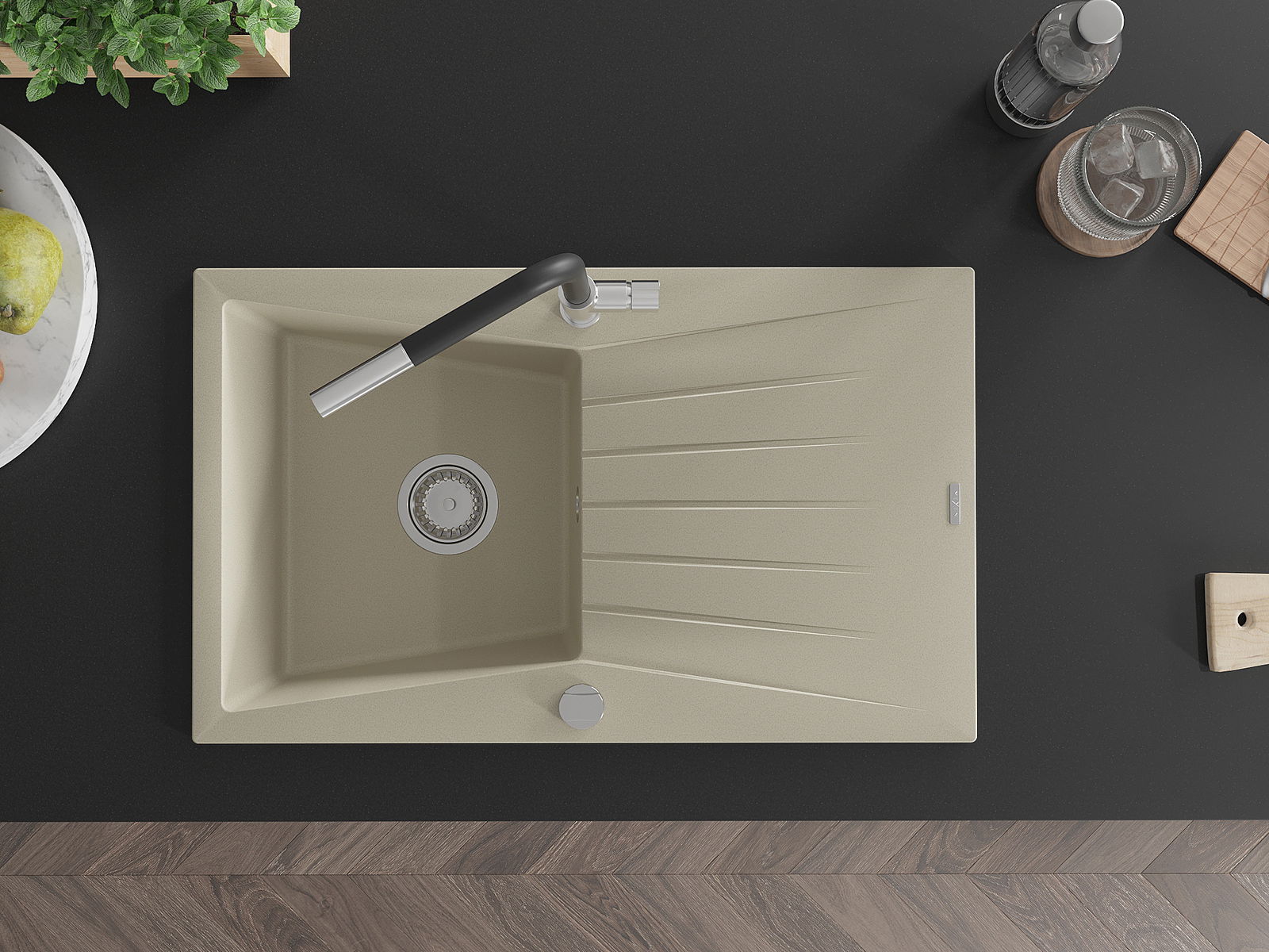 Mexen Cesar gránit mosogató 1-medencés csepegtetővel és Flora konyhai csapteleppel, bézs - 6514-69-670401-07