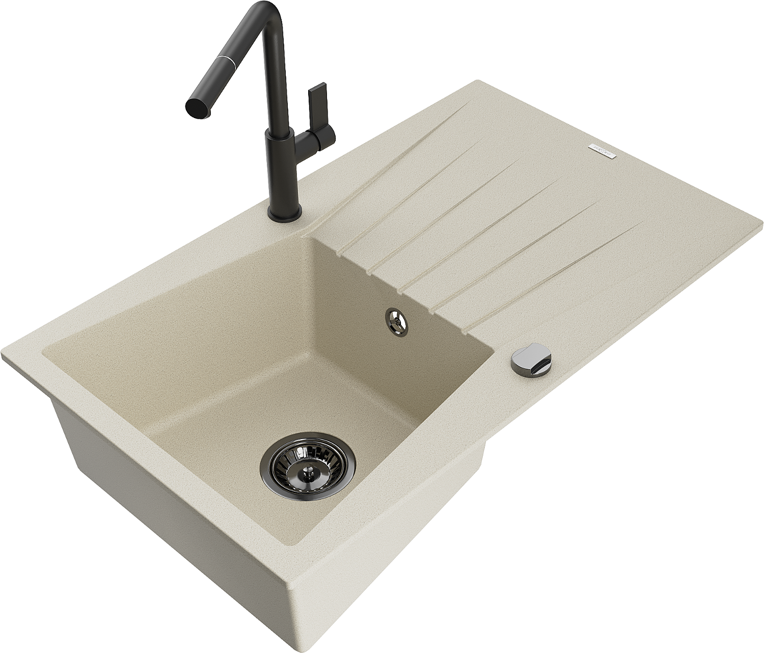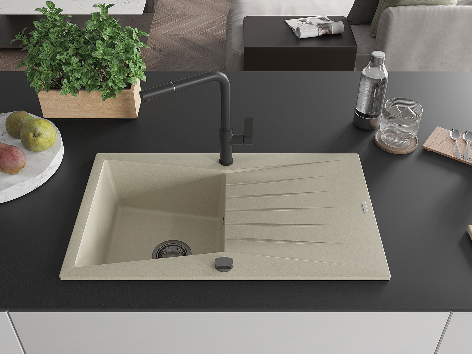 A mosogató magas minőségű gránitból készült. Elegáns, de mindenekelőtt praktikus kiegészítője minden konyhának, függetlenül annak stílusától. A gránit magas minősége és tartóssága hosszú távú használatot biztosít.