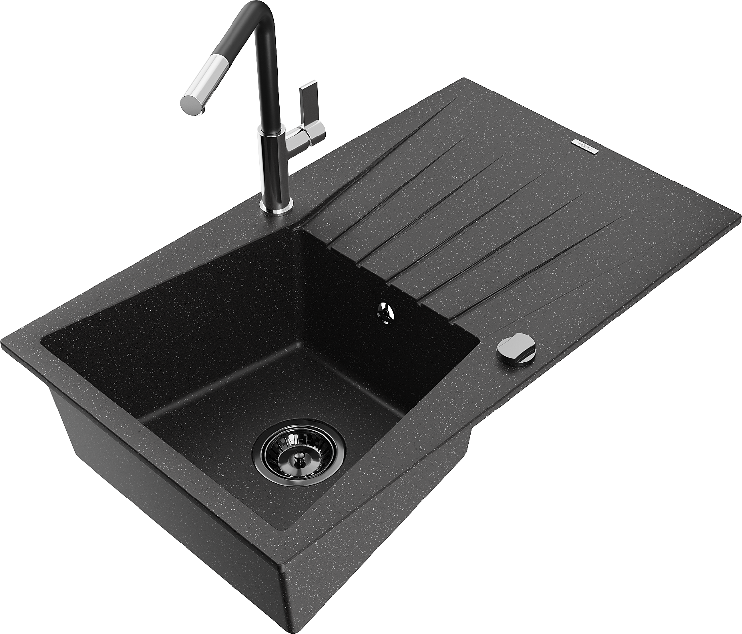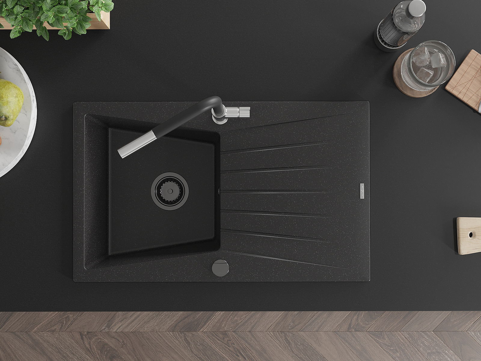Mexen Cesar egymedencés gránit mosogatótálca csepegtetővel és Flora konyhai csappal, fekete/ezüst metál - 6514-73-670401-07-B